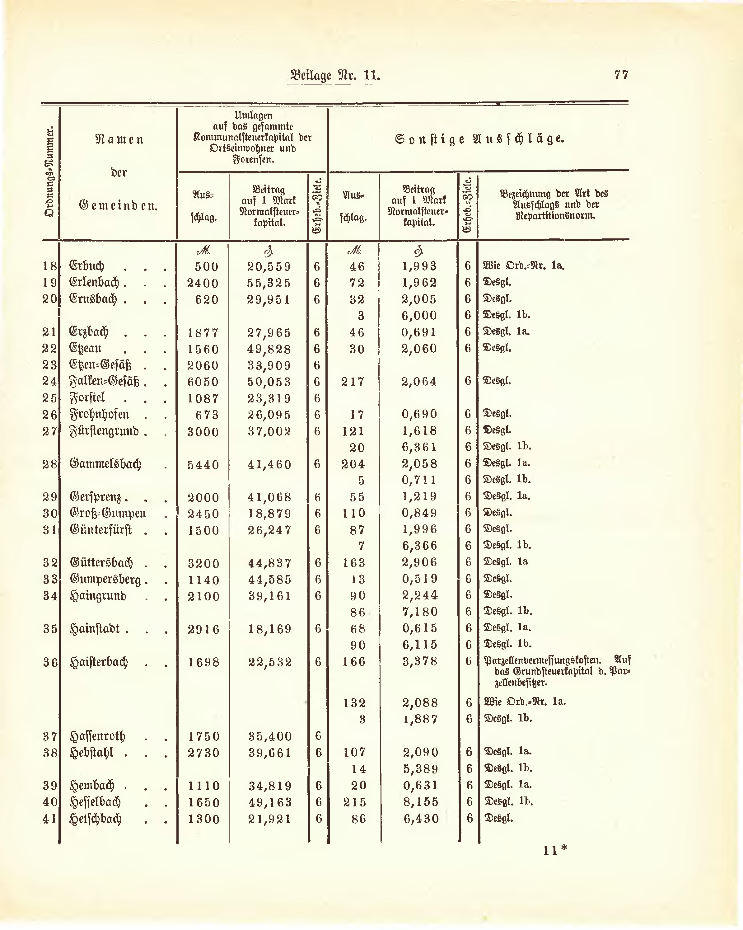 |rowspan=2 |Or<br />dn<br />un<br />gs<br />-N<br />um<br />me<br />r.||rowspan=2 |<center>Namen<br />der<br />Gemeinden.</center>||colspan=3 |<center>Umlagen<br />auf das gesammte<br />Kommunalsteuerkapital der<br />Ortseinwohner und<br />Forensen.</center>||colspan=4 |<center>Sonstige Ausschläge.</center> | |||