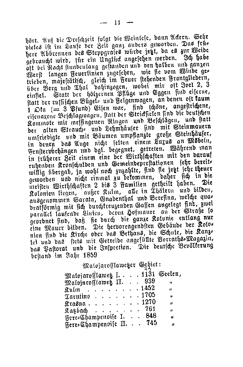 hört. Auf die Dreschzeit folgt die Weinlese, dann Ackern. Sehr vieles ist im Laufe der Zeit ganz anders geworden. Das frühere Abbrennen des Steppengrases würde jetzt, da es zur Weide gebraucht wird, für ein Unglück angesehen werden. Ich habe oft bei Nacht stundenlang gestanden und den halben und ganzen Werst langen Feuerlinien zugesehen, wie sie vom Winde getrieben, majestätisch, gleich im Feuer stehenden Frontgliedern, über Berg und Thal dahinzogen, wobei mir oft Joel 2, 3 einfiel. Statt der hölzernen Pflüge und Eggen sind eiserne, statt der russischen Bügel- und Felgenwagen, an denen oft kaum 1 Oka (= 3 Pfund) Eisen war, sind schöne, angestrichene, eisenaxene Beschlagwagen, statt der Stricksielen sind die deutschen Kommote mit messingenen Ringen und Beschlägen, und statt der alten Strauch- und Lehmhäuser sind mit Steinmauern umfriedigte und mit Bäumen umpflanzte große Steinhäuser, in denen das Auge nicht selten einem Luxus an Möbeln, Fenstervorhängen und dergleichen begegnet, getreten. Während man in früherer Zeit einem eine der Wirthschaften mit den darauf ruhenden Kronschulden und Gemeindeprestationen sehr bereitwillig übergab, ja wohl noch zuzahlte, sind sie jetzt sehr theuer geworden und nicht einmal zu bekommen, daher sich in die meisten Wirthschaften 2 bis 3 Familien getheilt haben. Die Kolonien liegen, außer Kulm, alle in Thälern und bilden, ausgenommen Sarata, Gnadenthal und Beresina, welche quadratförmig mit sich durchkreuzenden Gassen angelegt sind, zwei parallel laufende Linien, deren Hofmauer an der Straße so geordnet sind, daß sie durch die ganze Kolonie entlang nur eine Mauer bilden. Die hervorragenden Gebäude der Kolonien sind die Kirche oder das Bethaus, die Schule, die Kanzlei und das stets mit Getreide angefüllte Vorraths-Magazin, das Pastorat und die Inspection. Die deutsche Bevölkerung bestand im Jahr 1859