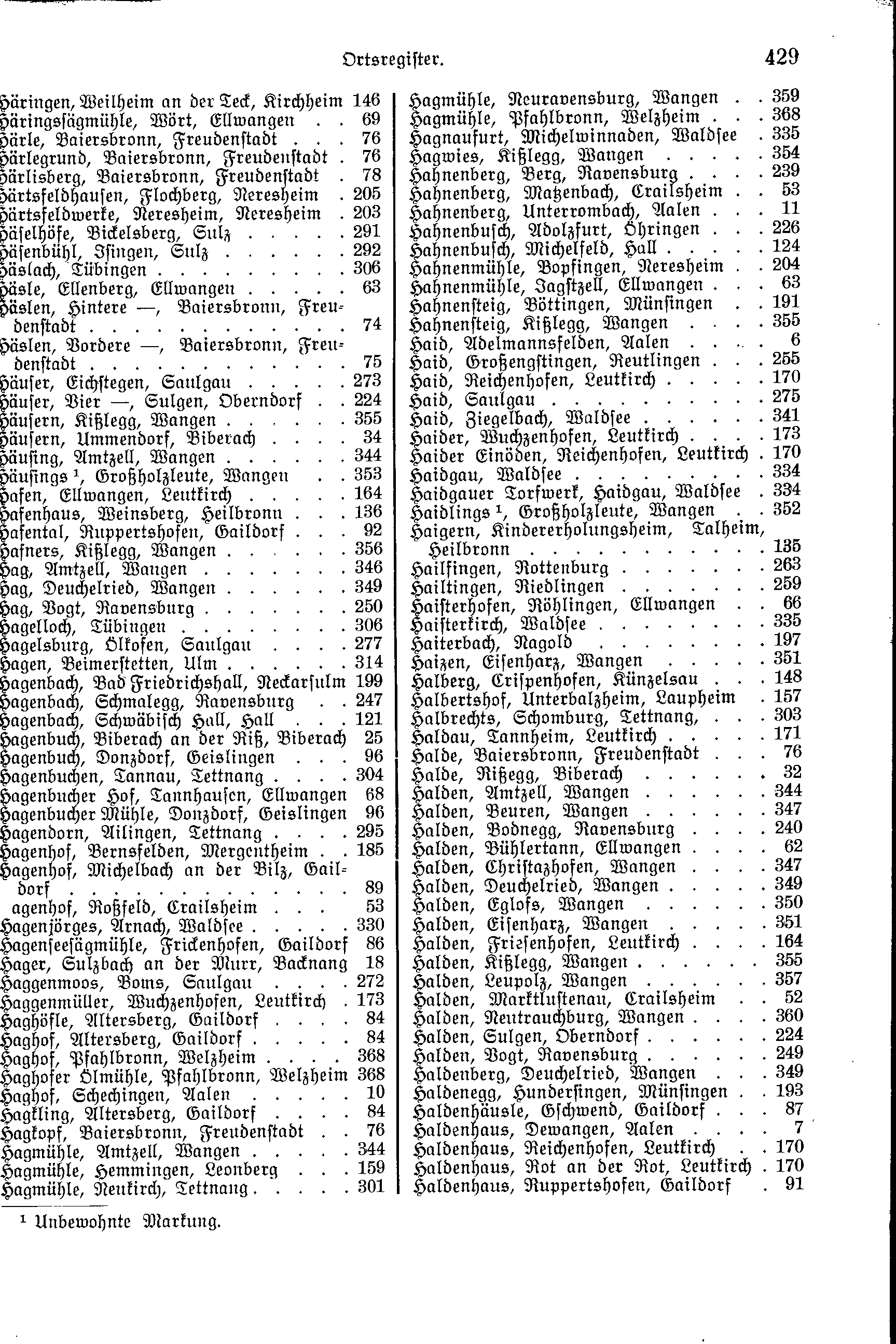 | Haghofer, Ölmühle, Pfahlbronn, Welzheim || [[../368|368]] || | | Haghofer, Ölmühle, Pfahlbronn, Welzheim || [[../368|368]] || Haldenberg, Deuchelried, Wangen || [[../349|349]] | ||