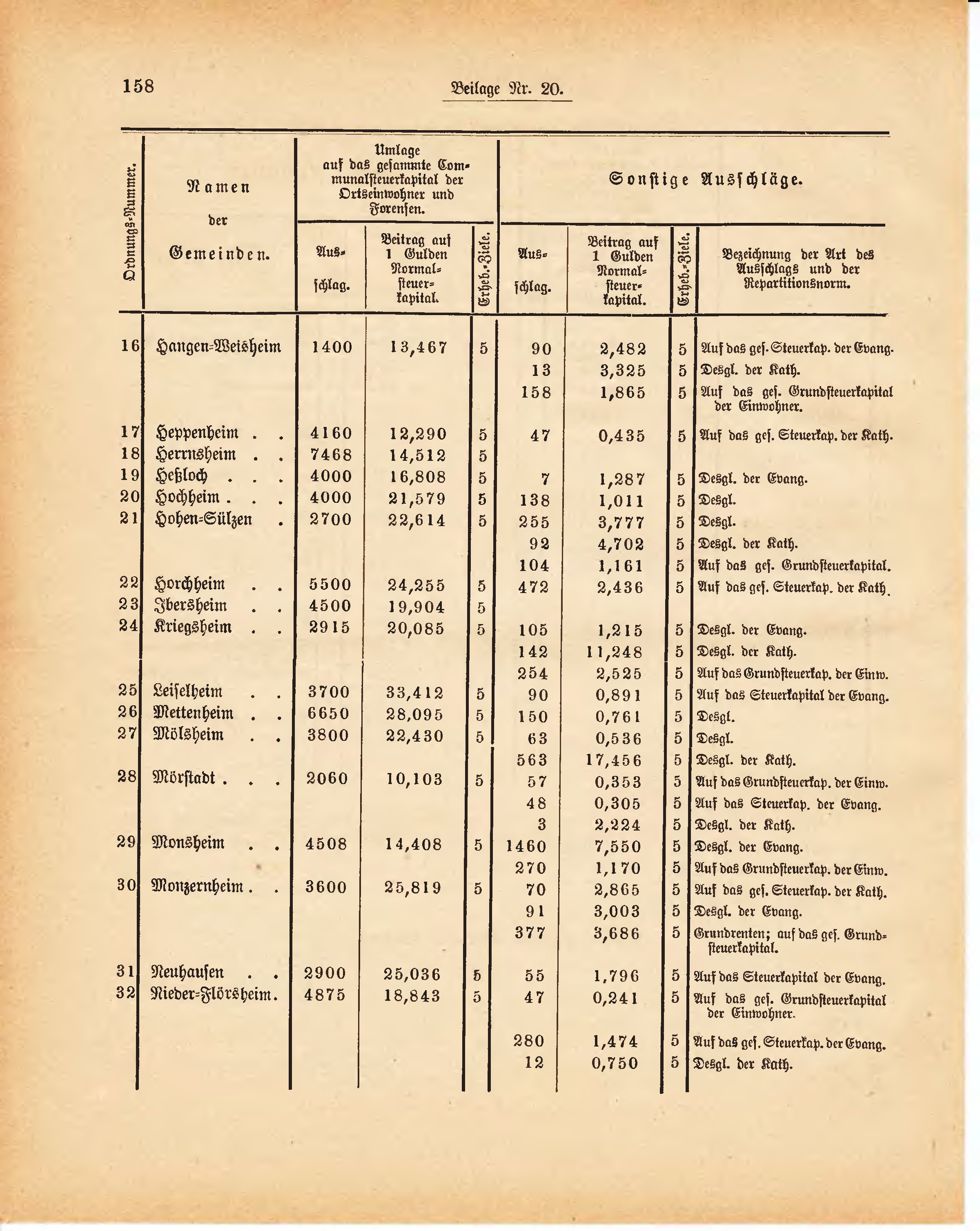 |valign="top" |16||valign="top" | Hangen-Weisheim||valign="top" | 1400||valign="top" | 1,467||valign="top" | 5||valign="top" | 90<br />13<br />158||valign="top" | 2,482<br />3,325<br />1,865||valign="top" | 5<br />5<br />5|| Auf das ges. Steuerkap. der Evang.<br /> Desgl. der Kath.<br />Auf das ges. Grundsteuerkapital<br />der Einwohner. | |||