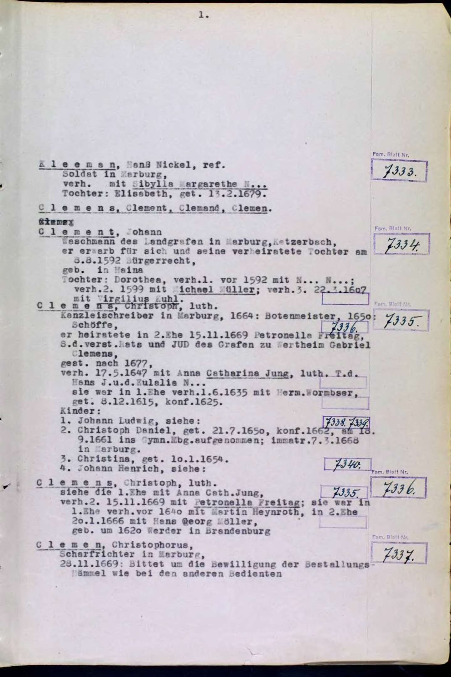 | Seit Fertigstellung des Marburger Sippenbuches 1950-1966 sind zahlreiche Ergänzungen und auch notwendige Korrekturen bekannt geworden. Zur aktuellen Seite existiert noch keine Ergänzunges- und Korrekturseite. Wenn Sie selbst Ergänzungen vornehmen möchten, wenden Sie sich bitte an Benutzer:Ernestus. |