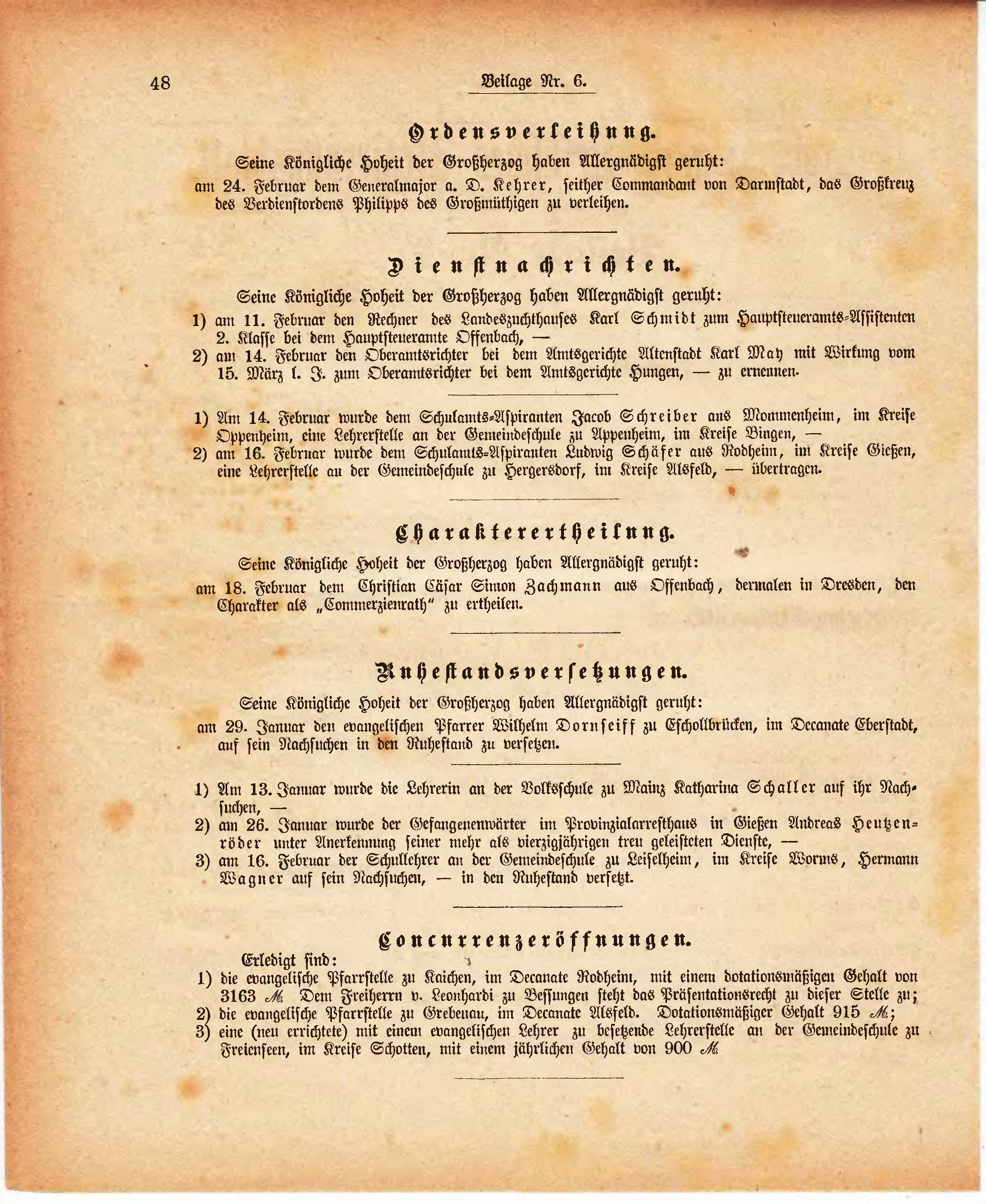 | 2) | am 16. Februar wurde dem Schulamts-Aspiranten Ludwig Schäfer aus Rodheim, im Kreise Gießen, eine Lehrerstelle an der Gemeindeschule zu Hergersdorf, im Kreise Alsfeld, - übertragen. |
