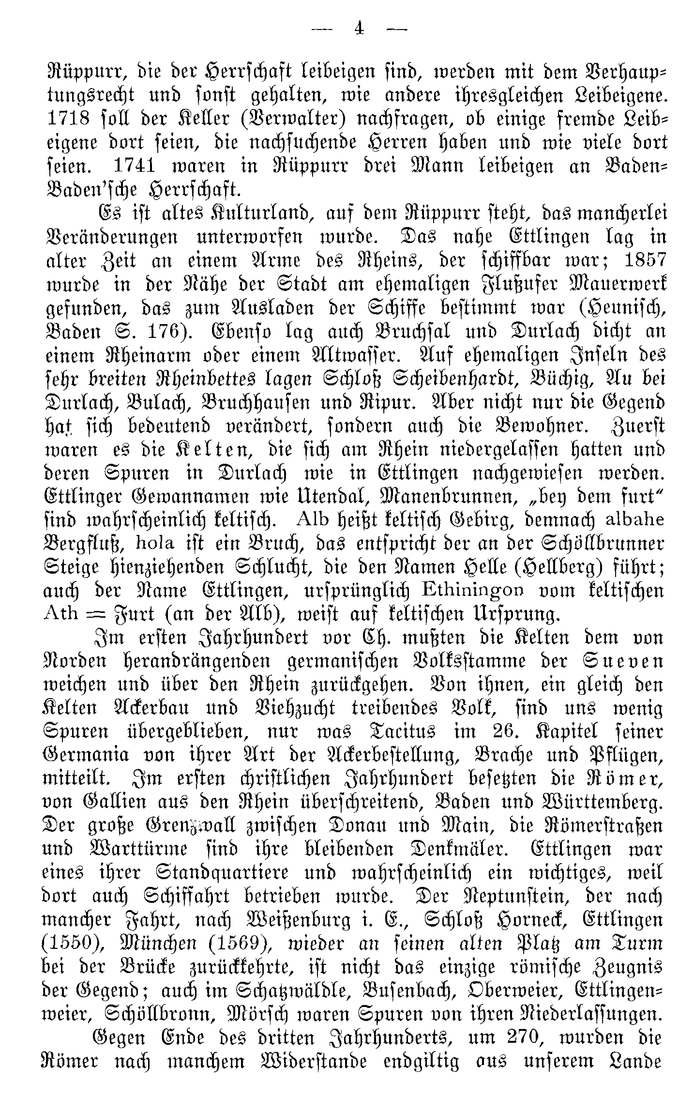 Im ersten Jahrhundert vor Ch. mußten die Kelten dem von Norden herandrängenden germanischen Volksstamme der Sueven weichen und über den Rhein zurückgehen. Von ihnen, ein gleich den Kelten Ackerbau und Viehzucht treibendes Volk, sind uns wenig Spuren übergeblieben, nur was Tacitus im 26. Kapitel seiner Germania von ihrer Art der Ackerbestellung, Brache und Pflügen, mitteilt. Im ersten christlichen Jahrhundert besetzten die Römer, von Gallien aus den Rhein überschreitend, Baden und Württemberg. Der große Grenzwall zwischen Donau und Main, die Römerstraßen und Warttürme sind ihre bleibenden Denkmäler. Ettlingen war eines ihrer Standquartiere und wahrscheinlich ein wichtiges, weil dort auch Schiffahrt betrieben wurde. Der Neptunstein, der nach mancher Fahrt, nach Weißenburg i. E., Schloß Horneck, Ettlingen (1550), München (1569), wieder an seinen alten Platz am Turm bei der Brücke zurückkehrte, ist nicht das einzige römische Zeugnis der Gegend; auch im Schatzwäldle, Busenbach, Oberweier, Ettlingenweier, Schöllbronn, Mörsch waren Spuren von ihren Niederlassungen.
