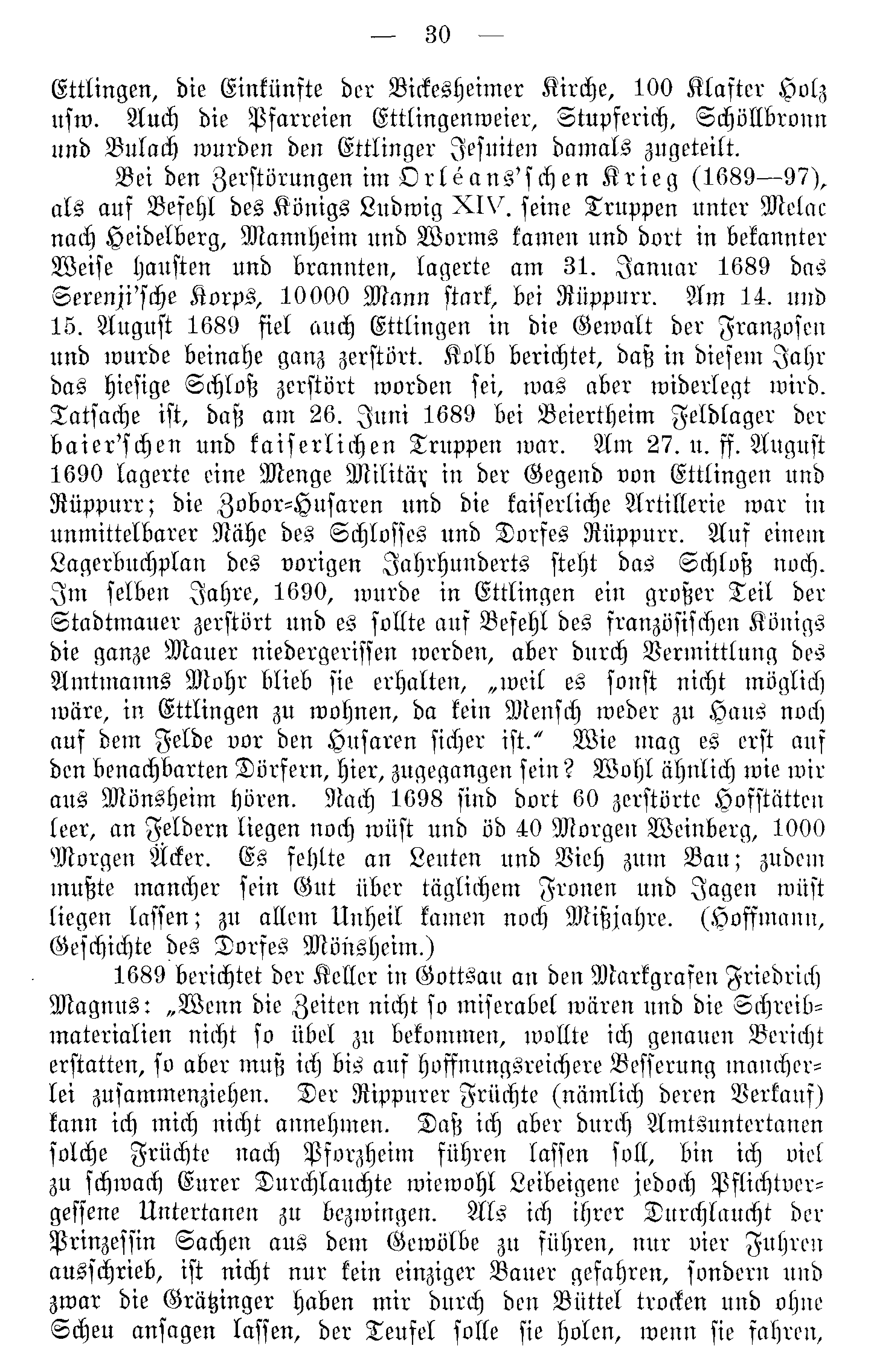 Bei den Zerstörungen im Orlcåans’sch en Krieg (1689—97), als aus Befehl des Königs Ludwig XIV . seine Truppen unter Melac nach Heidelberg, Mannheim und Worms kamen und dort in bekannter Weise hausten und brannten, lagerte am 31. Januar 1689 das Serenji’sche Korps, 10000 Mann stark, bei Rüppurr. Am 14. und 15. August 1689 fiel auch Ettlingen in die Gewalt der Franzosen und wurde beinahe ganz zerstört. Kolb berichtet, daß in diesem Jahr das hiesige Schloß zerstört worden fei, was aber widerlegt wird. Tatsache ist, daß am 26. Juni 1689 bei Beiertheim Feldlager der baier’schen und kaiserlichen Truppen war. Am 27. u. August 1690 lagerte eine Menge Militär in der Gegend von Ettlingen und Rüppurr; die Zobor-Husaren und die kaiserliche Artillerie war in unmittelbarer Nähe des Schlosses und Dorfes Rüppurr. Auf einem Lagerbuchplan des vorigen Jahrhunderts steht das Schloß noch. Jm selben Jahre, 1690, wurde in Ettlingen ein großer Teil der Stadtmauer zerstört und es sollte auf Befehl des französischen Königs die ganze Mauer niedergerissen werden, aber durch Vermittlung des Amtmanns Mohr blieb sie erhalten, »weil es sonst nicht möglich wäre, in Ettlingen zu wohnen, da kein Mensch weder zu Haus noch auf dem Felde vor den Husaren sicher ist« Wie mag es erst auf den benachbarten Dörsern, hier, zugegangen sein? Wohl ähnlich wie wir aus Mönsheim hören. Nach 1698 sind dort 60 zerstörte Hofstätten leer, an Feldern liegen noch wüst und öd 40 Morgen Weinberg, 1000 Morgen Acker. Es fehlte an Leuten und Vieh zum Bau; zudem mußte mancher sein Gut über täglichem Fronen und Jagen wüft liegen lassen; zu allem Unheil kamen noch Mißjahre (Hoffmann, Geschichte des Dorfes Mönsheim.)
