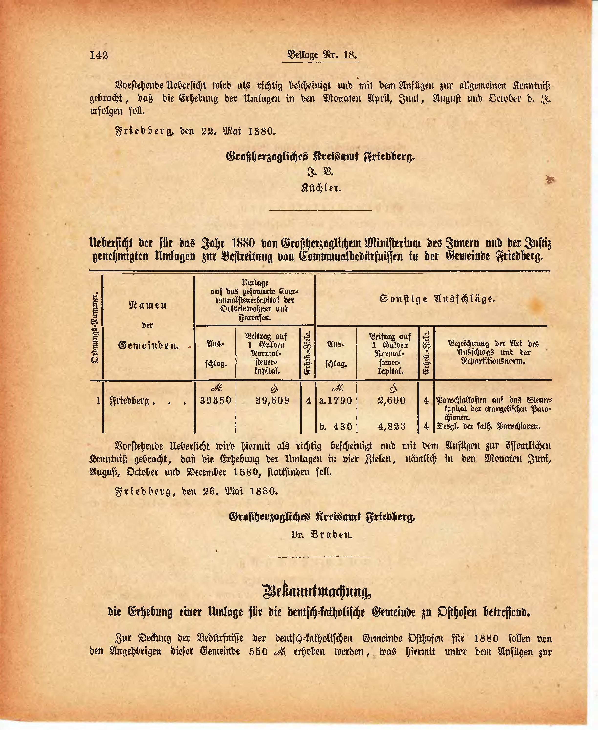 <center>'''Uebersicht der für das Jahr 1880 von Großherzoglichem Ministerium des Innern und der Justiz genehmigten Umlagen zur Bestreitung von Communalbedürfnissen in der Gemeinde Friedberg.''' | |||