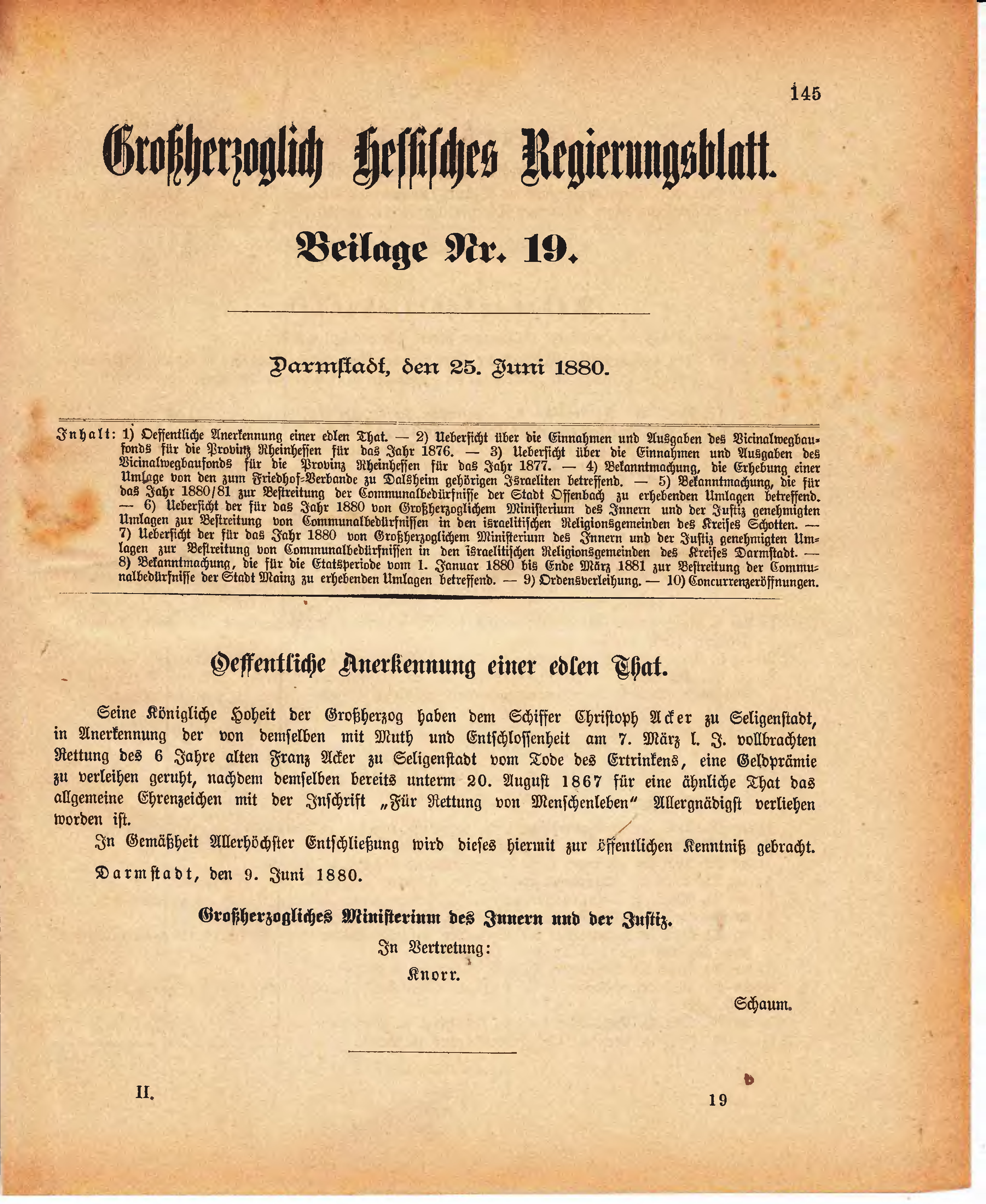 Seine Königliche Hoheit der Großherzog haben dem Schiffer Christoph Acker zu Seligenstadt, in Anerkennung der von demselben mit Muth und Entschlossenheit am 7. März l. J. vollbrachten Rettung des 6 Jahre alten Franz Acker zu Seligenstadt vom Tode des Ertrinkens, eine Geldprämie zu verleihen geruht, nachdem demselben bereits unterm 20. August 1867 für eine ähnliche That das allgemeine Ehrenzeichen mit der Inschrift "Für Rettung von Menschenleben" Allergnädigst verliehen worden ist.
