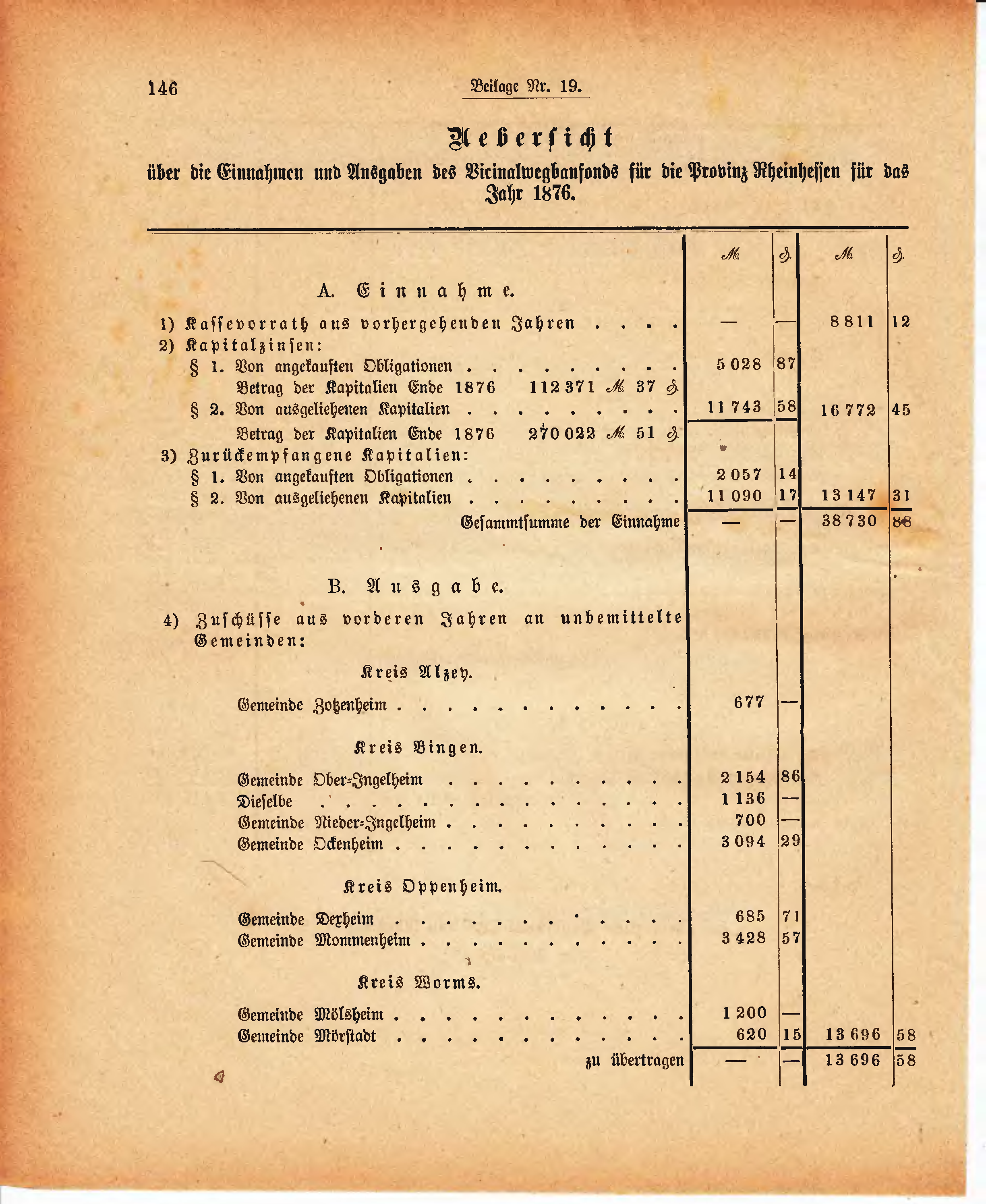 über die Einnahmen und Ausgaben des Vicinalwegbaufonds für die Provinz Rheinhessen für das Jahr 1876.