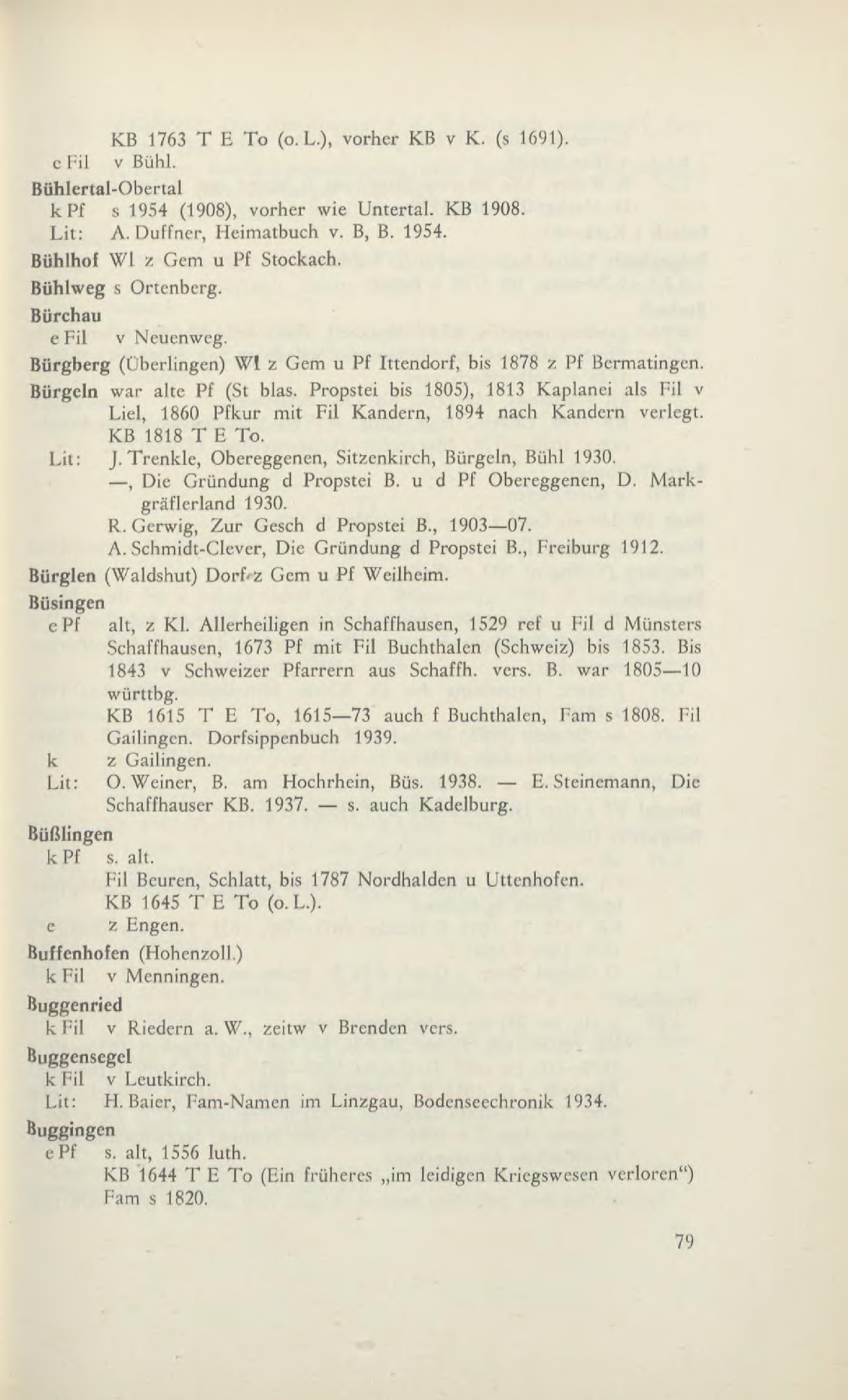 gräflerland 1930. R.Gerwig, Zur Gesch d Propstei B., 1903–07. A. Schmidt-Clever, Die Gründung d Propstei B., Freiburg 1912. Bürglen (Waldshut) Dorf-z Gern u Pf Weilheim. Büsingen ePf alt, z Kl. Allerheiligen in Schaffhausen, 1529 ref u Fi] d Münsters SchaFfhausen, 1673 Pf mit Fil Buchthaien (Schweiz) bis 1853, Bis 1843 v Schweizer Pfarrern aus Schaffh. vers. B. war 1805–10 württbg.