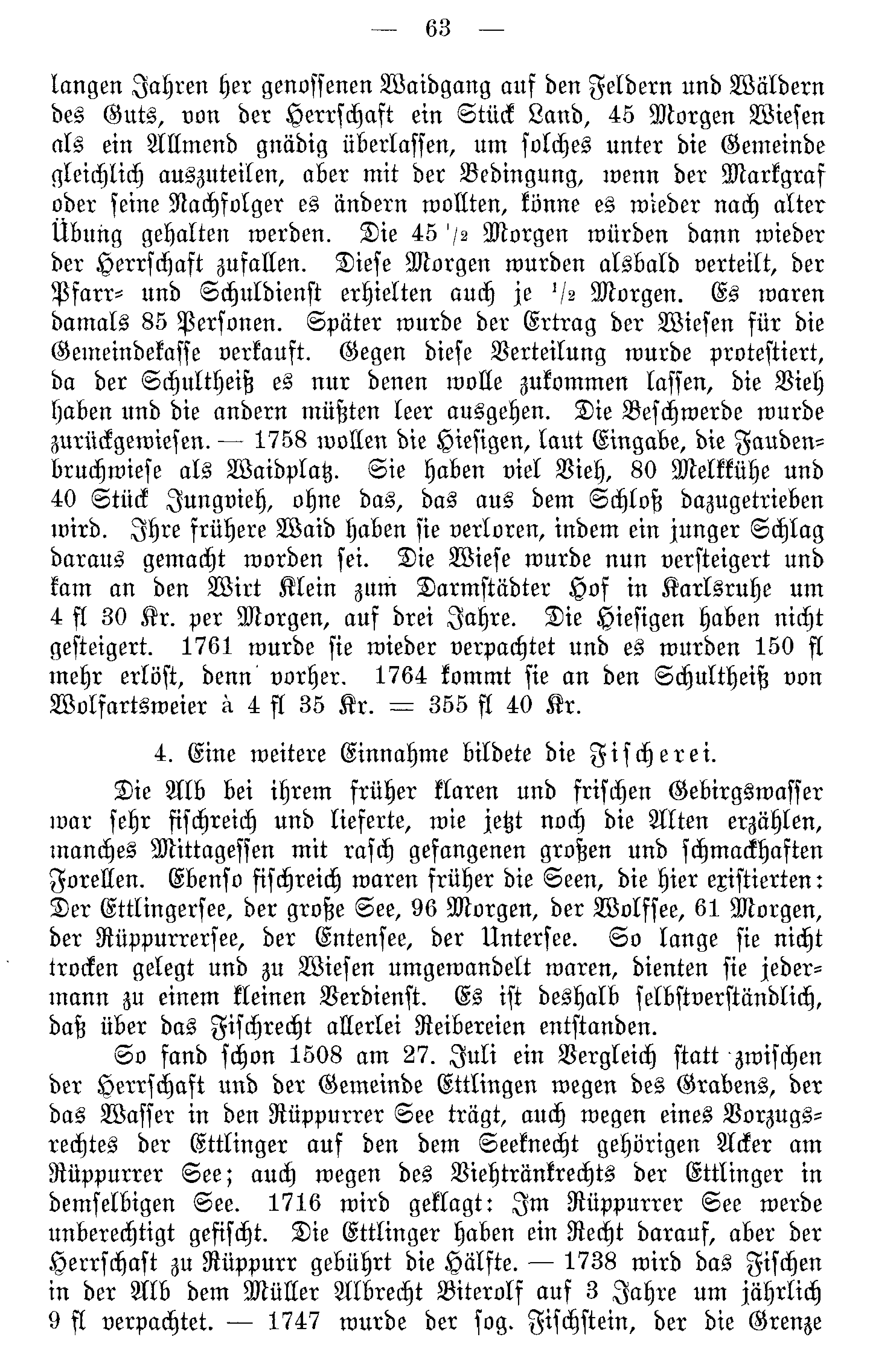 Die Alb bei ihrem früher klaren und frischen Gebirgswasser war sehr fischreich und lieferte, wie jetzt noch die Alten erzählen, manches Mittagessen mit rasch gefangenen großen und schmackhaften Forellen. Ebenso fischreich waren früher die Seen, die hier existierten: Der Ettlingersee, der große See, 96 Morgen, der Wolfsee, 61 Morgen, der Rüppurrersee, der Entensee, der Untersee. So lange sie nicht trocken gelegt und zu Wiesen umgewandelt waren, dienten sie jedermann zu einem kleinen Verdienst. Es ist deshalb selbstverständlich, daß über das Fischrecht allerlei Reibereien entstanden.