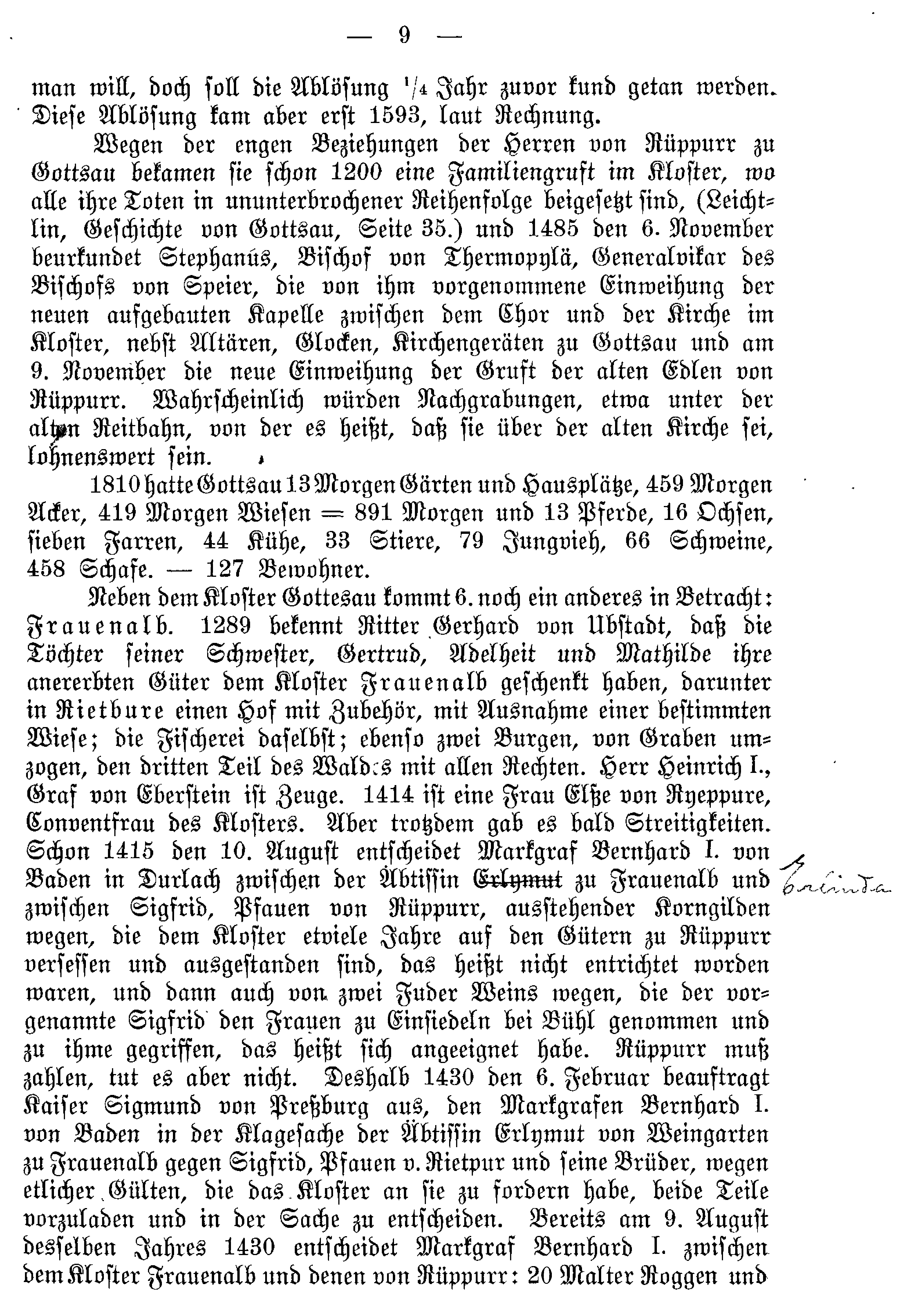 Neben dem Kloster Gottesau kommt 6. noch ein anderes in Betracht: Frauenalb. 1289 bekennt Ritter Gerhard von Ubstadt, daß die Töchter seiner Schwester, Gertrud, Adelheit und Mathilde ihre anererbten Güter dem Kloster Frauenalb geschenkt haben, darunter in Rietbure einen Hof mit Zubehör, mit Ausnahme einer bestimmten Wiese; die Fischerei daselbst; ebenso zwei Burgen, von Graben umzogen, den dritten Teil des Waldes mit allen Rechten. Herr Heinrich I., Graf von Eberstein ist Zeuge. 1414 ist eine Frau Elße von Ryeppure, Conventfrau des Klosters. Aber trotzdem gab es bald Streitigkeiten. Schon 1415 den 10. August entscheidet Markgraf Bernhard I. von Baden in Durlach zwischen der Äbtissin Erlymut[1] zu Frauenalb und zwischen Sigfrid, Pfauen von Rüppurr, ausstehender Korngilden wegen, die dem Kloster etviele Jahre auf den Gütern zu Rüppurr versessen und ausgestanden sind, das heißt nicht entrichtet worden waren, und dann auch von zwei Fuder Weins wegen, die der vorgenannte Sigfrid den Frauen zu Einsiedeln bei Bühl genommen und zu ihme gegriffen, das heißt sich angeeignet habe. Rüppurr muß zahlen, tut es aber nicht. Deshalb 1430 den 6. Februar beauftragt Kaiser Sigmund von Preßburg aus, den Markgrafen Bernhard I. von Baden in der Klagesache der Äbtissin Erlymut von Weingarten zu Frauenalb gegen Sigfrid, Pfauen v. Rietpur und seine Brüder, wegen etlicher Gülten, die das Kloster an sie zu fordern habe, beide Teile vorzuladen und in der Sache zu entscheiden. Bereits am 9. August desselben Jahres 1430 entscheidet Markgraf Bernhard I. zwischen dem Kloster Frauenalb und denen von Rüppurr: 20 Malter Roggen und