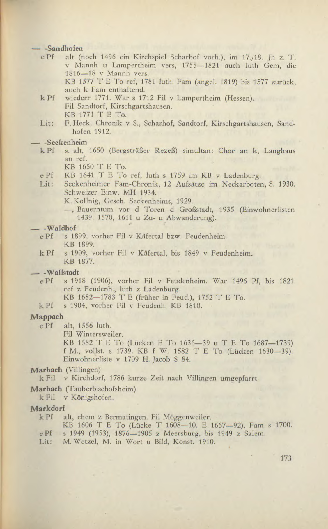| e Pf | s 1918 (1906), vorher Fil v Feudenheim. War 1496 Pf, bis 1821 ref z Feudenh., luth z Ladenburg. | |