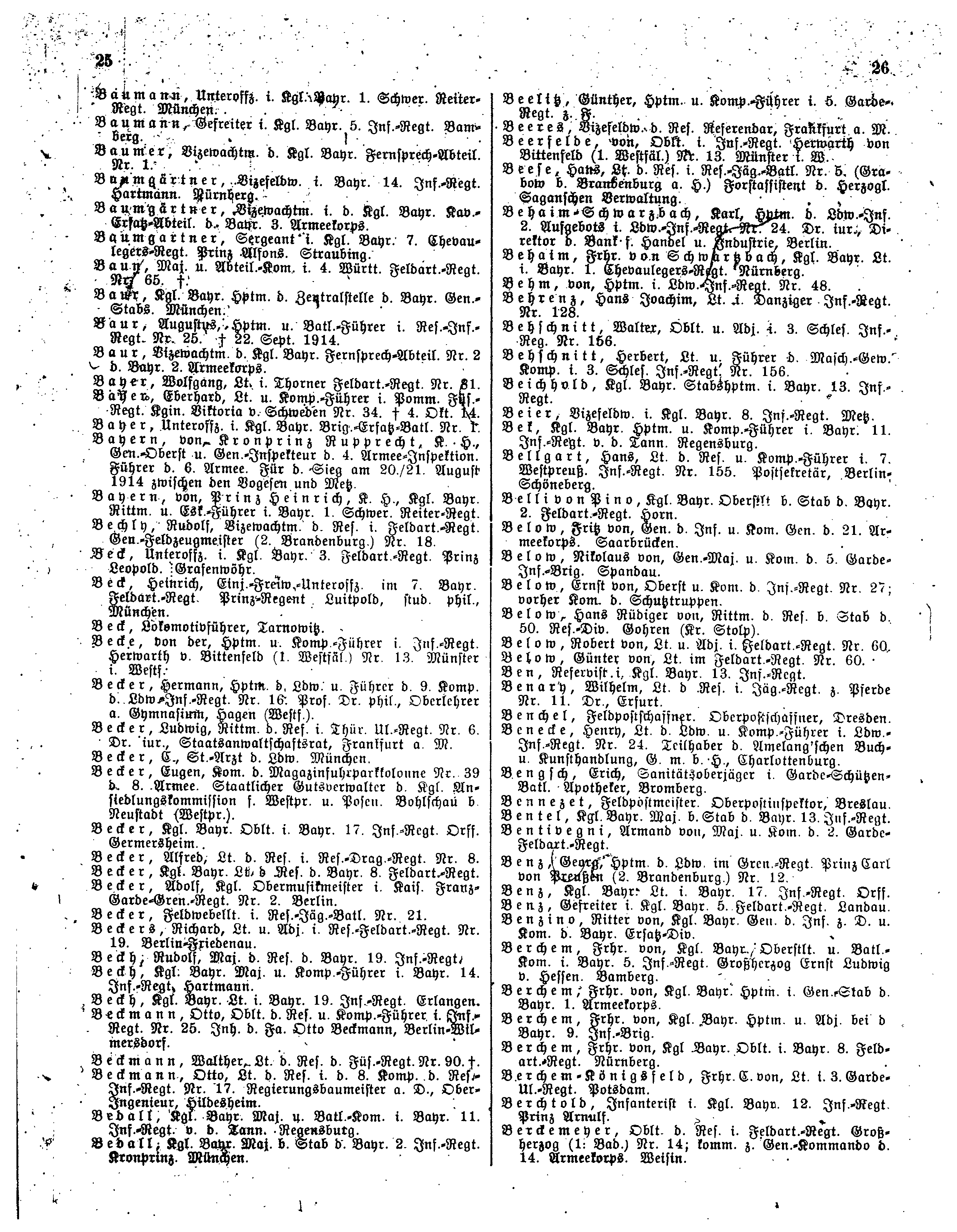 | | | ''Bellgart'', Hans, Lt. d. Res. u. Komp.-Führer i. 7. Westpreuß. Inf.-Regt. Nr. 155. Postsekretär, Berlin-Schöneberg. | ||