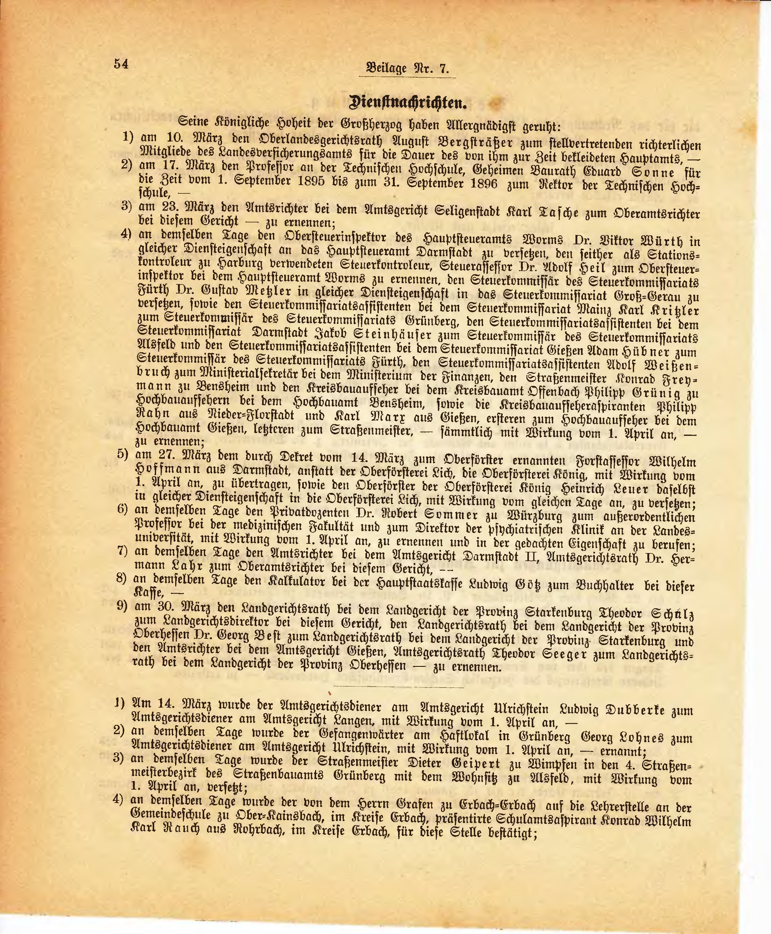 |valign="top" |4)|| an demselben Tage den Obersteuerinspektor des Hauptsteueramts Worms ''Dr.'' Viktor {{Sperrschrift |Würth}} in gleicher Diensteigenschaft an das Hauptsteueramt Darmstadt zu versetzen, den seither als Stationskontroleur zu Harburg verwendeten Steuerkontroleur, Steuerassessor ''Dr.'' Adolf {{Sperrschrift |Heil}} zum Obersteuerinspektor bei dem Hauptsteueramt Worms zu ernennen, den Steuerkommissär des Steuerkommissariats Fürth ''Dr.'' Gustav {{Sperrschrift |Metzler}} in gleicher Diensteigenschaft in das Steuerkommissariat Groß-Gerau zu versetzen, sowie den Steuerkommissariatsassistenten bei dem Steuerkommissariat Mainz Karl {{Sperrschrift |Kritzler}} zum Steuerkommissär des Steuerkommissariats Grünberg, den Steuerkommissariatsassistenten bei dem Steuerkommissariat Darmstadt Jakob {{Sperrschrift |Steinhäuser}} zum Steuerkommissär des Steuerkommissariats Alsfeld und den Steuerkommissariatsassistenten bei dem Steuerkommissariat Gießen Adam {{Sperrschrift |Hübner}} zum Steuerkommissär des Steuerkommissariats Fürth, den Steuerkommissariatsassistenten Adolf {{Sperrschrift |Weißenbruch}} zum Ministerialsekretär bei dem Ministerium der Finanzen, den Straßenmeister Konrad {{Sperrschrift |Freymann}} zu Bensheim und den Kreisbauaufseher bei dem Kreisbauamt Offenbach Philipp {{Sperrschrift |Grünig}} zu Hochbauaufsehern bei dem Hochbauamt Bensheim, sowie die Kreisbauaufseheraspiranten Philipp {{Sperrschrift |Rahn}} aus Nieder-Florstadt und Karl {{Sperrschrift |Marx}} aus Gießen, ersteren zum Hochbauaufseher bei dem Hochbauamt Gießen, letzteren zum Straßenmeister, - sämmtlich mit Wirkung vom 1. April an, - zu ernennen;