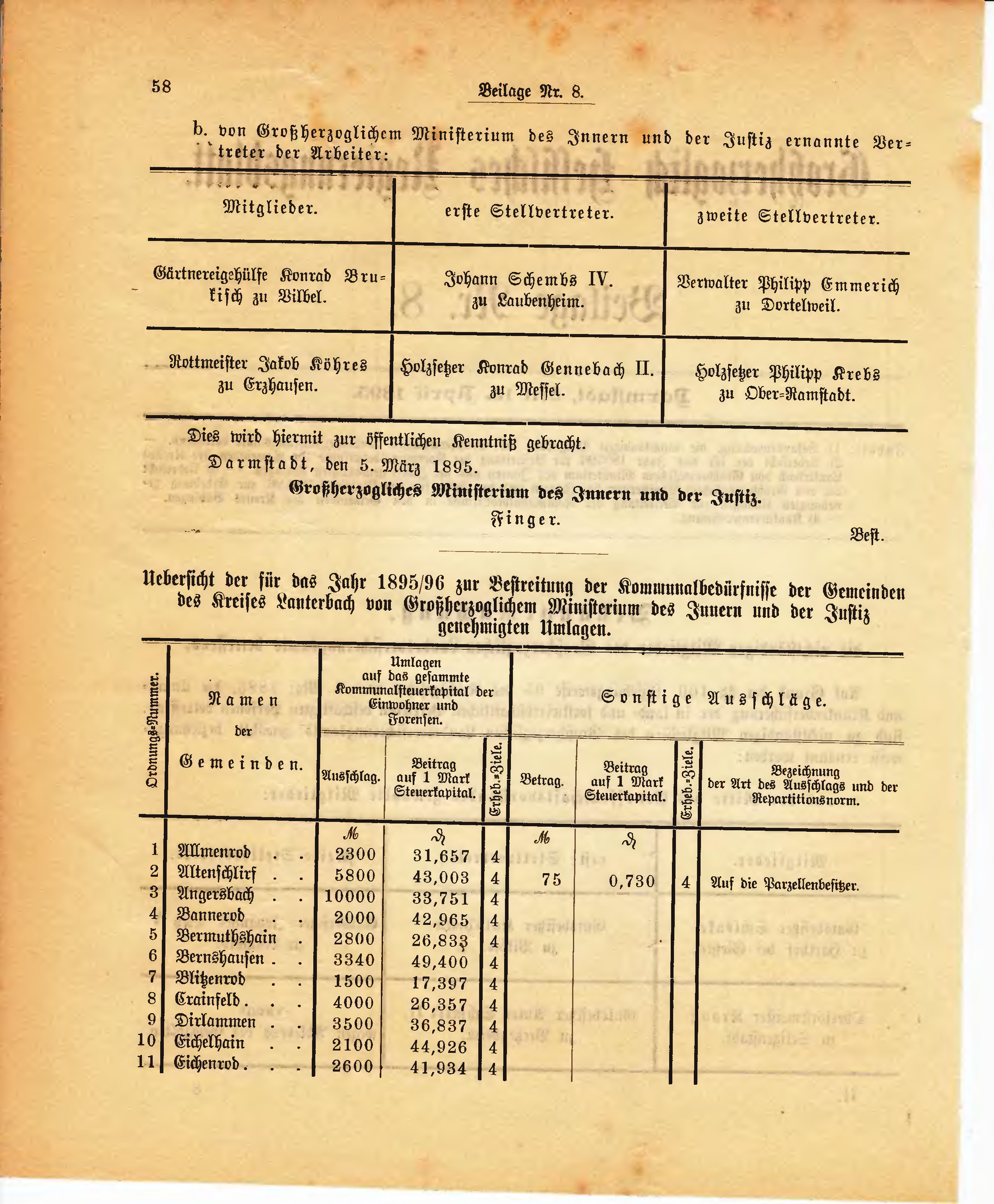Uebersicht der für das Jahr 1895/96 zur Bestreitung der Kommunalbedürfnisse der Gemeinden des Kreises Lauterbach von Großherzoglichem Ministerium des Innern und der Justiz genehmigten Umlagen.