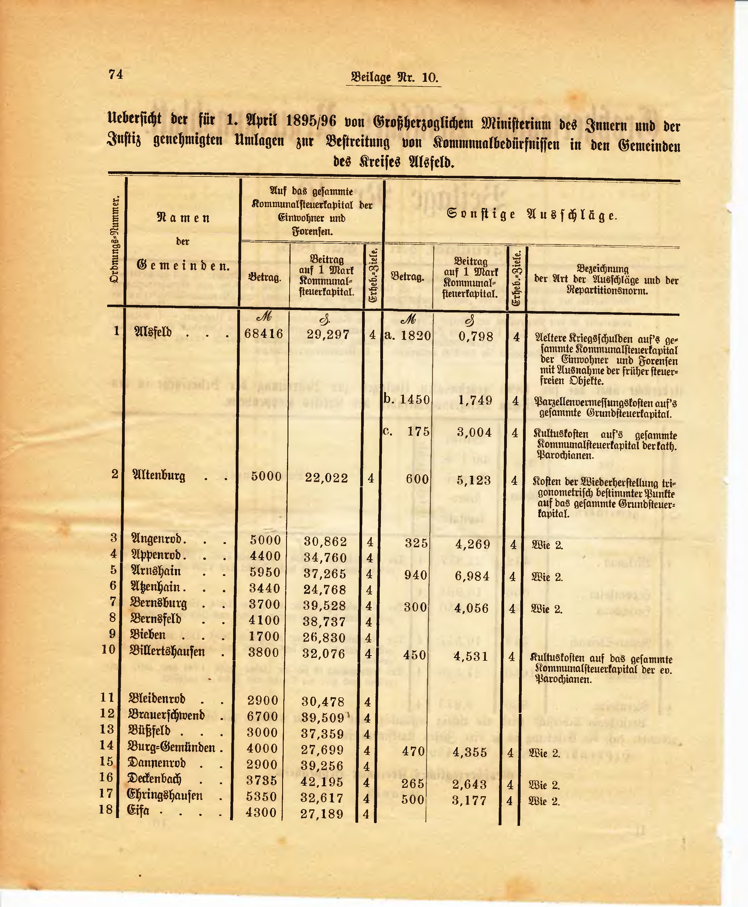 Uebersicht der für 1. April 1895/96 von Großherzoglichem Ministerium des Innern und der Justiz genehmigten Umlagen zur Bestreitung von Kommunalbedürfnissen in den Gemeinden des Kreises Alsfeld.