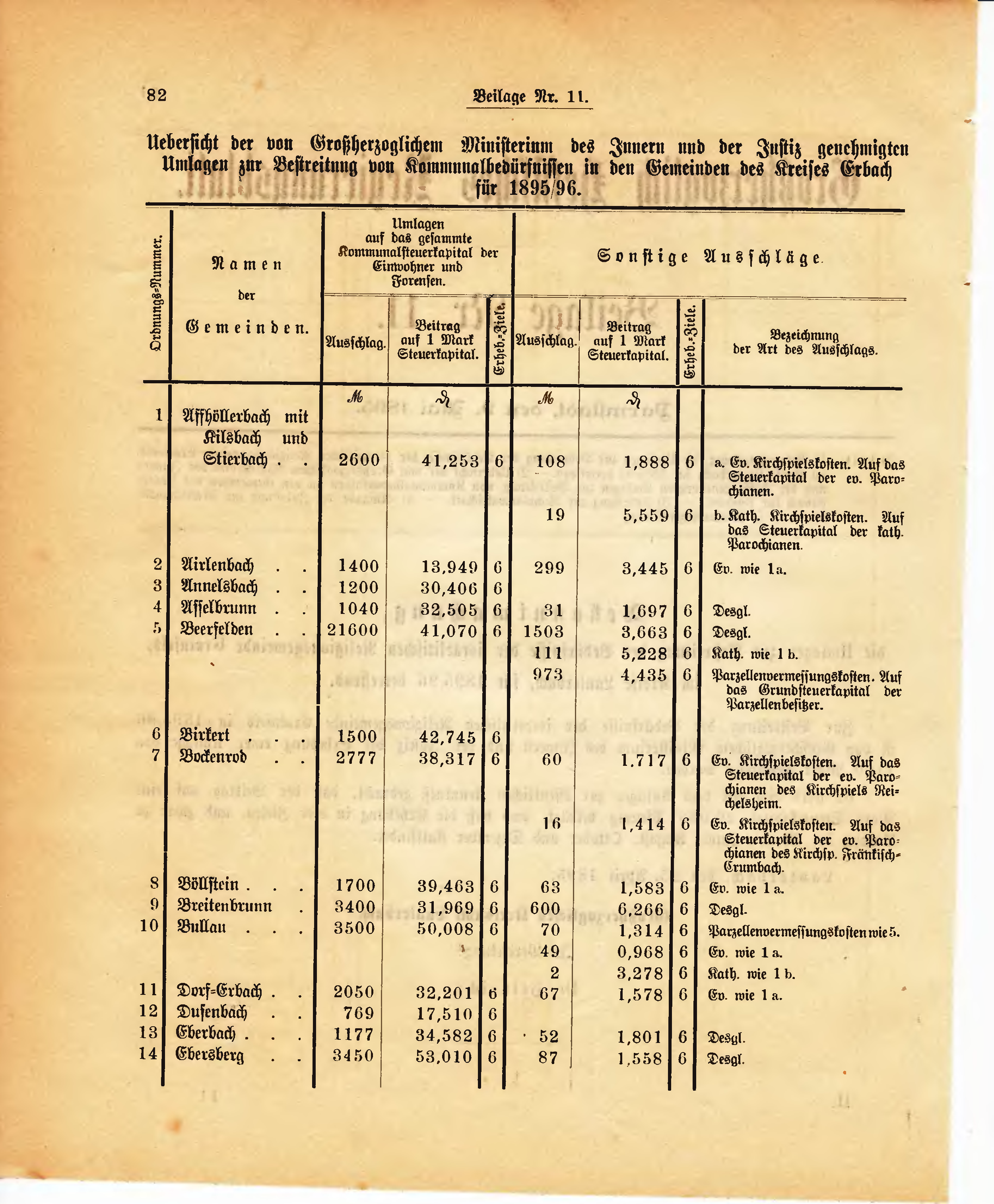 Uebersicht der von Großherzoglichem Ministerium des Innern und der Justiz genehmigten Umlagen zur Bestreitung von Kommunalbedürfnissen in den Gemeinden des Kreises Erbach für 1895/96.