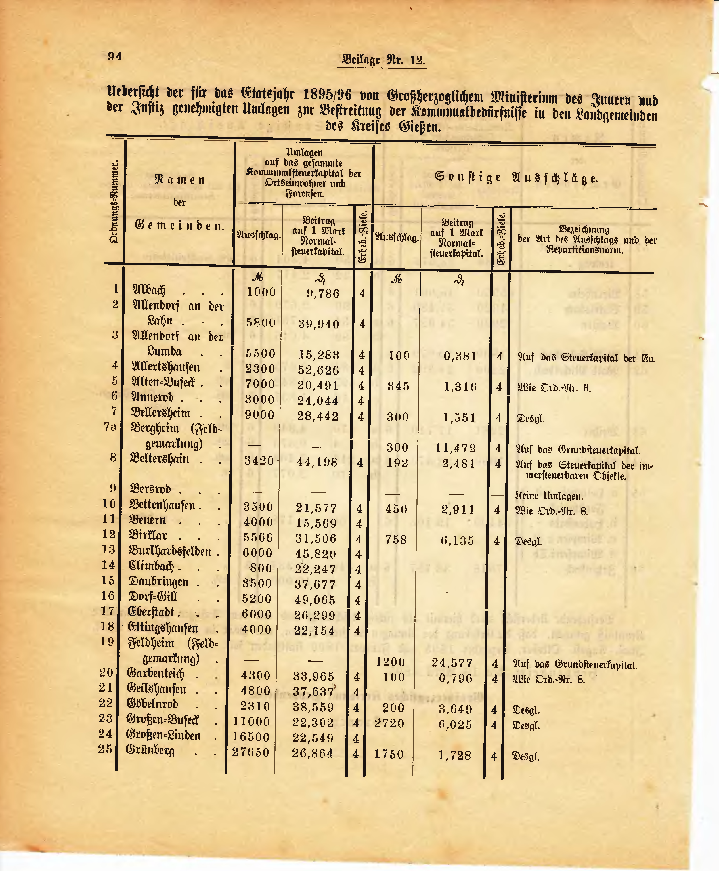 Uebersicht der für das Etatsjahr 1895/96 von Großherzoglichem Ministerium des Innern und der Justiz genehmigten Umlagen zur Bestreitung der Kommunalbedürfnisse in den Landgemeinden des Kreises Gießen.
