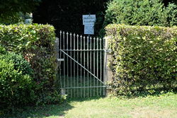 Versteckt am Wiedenbrücker Tor liegt der eingezäunte Friedhof in einem Baugebiet hinter einer dichten Hecke.