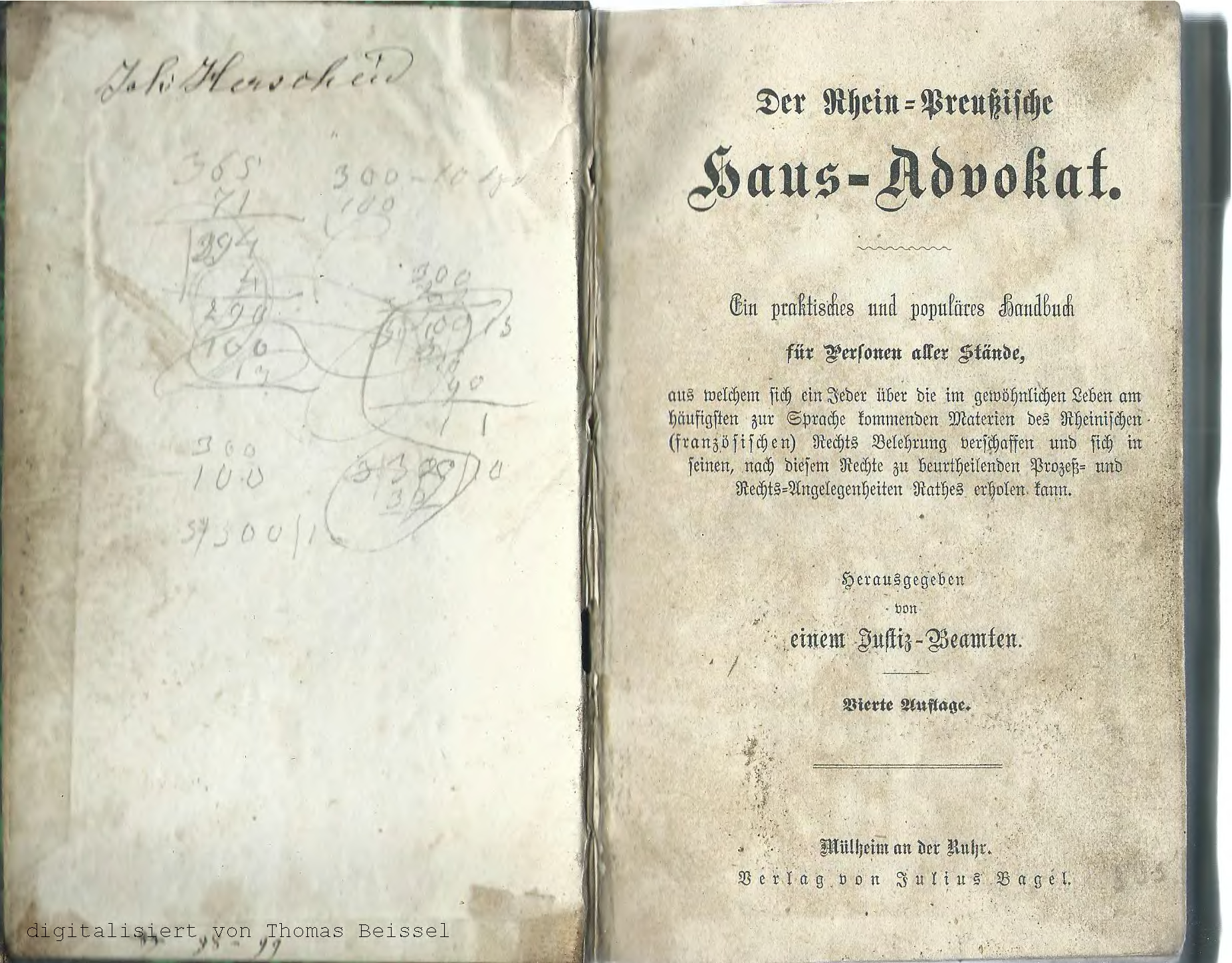 | Titel: | Der Rhein-Preußische Haus-Advokat : Ein praktisches und populäres Handbuch für Personen aller Stände, aus welchem sich ein Jeder über die im gewöhnlichen Leben am häufigsten zur Sprache kommenden Materien des Rheinischen (französischen) Rechts Belehrung verschaffen und sich in seinen, nach diesem Rechte zu beurtheilenden Prozeß- und Rechts-Angelegenheiten Rathes erholen kann |
