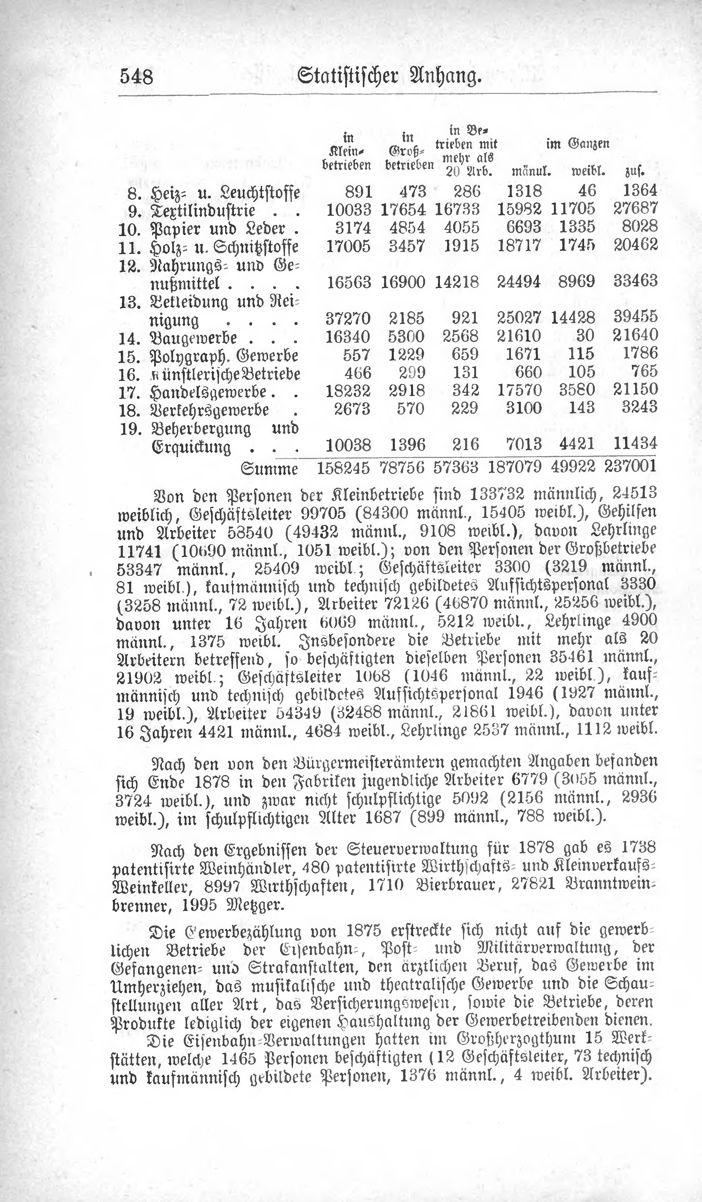 {{NE}}Von den Personen der Kleinbetriebe sind 133732 männlich, 24516 weiblich, Geschäftsleiter 99705 (84300 männl., 15405 weibl.) Gehilfen und Arbeiter 58540 (49432 männl., 9108 weibl.), davon Lehrlingen 11741 (10690 männl., 1051 weibl.); von den Personen der Großbetriebe 53347 männl., 25409 weibl; Geschäftsleiter 3300 (3219 männl., 81 weibl.), kaufmännisch und technisch gebildetes Aufsichtspersonal 3330 (3258 männl., 72 weibl.), Arbeiter 72126 (46870 männl., 25256 weibl.), davon unter 16 Jahren 6069 männl., 5212 weibl., Lehrlinge 4900 männl., 1375 weibl. Insbesondere die Betriebe mit mehr als 20 Arbeitern betreffend, so beschäftigen dieslben Personen 35461 männ., 21902 weibl.; Geschäftsleiter 1068 (1046 männl., 22 weibl.), kaufmännisch und technisch gebildetes Aufsichtspersonal 1946 (1927 männl., 19 weibl.), Arbeiter 54349 (32488 männl., 2537 weibl.), davon unter 16 Jahren 4421 männl., 4684 weibl., Lehrlingen 2537 männl., 1112 weibl. | |||