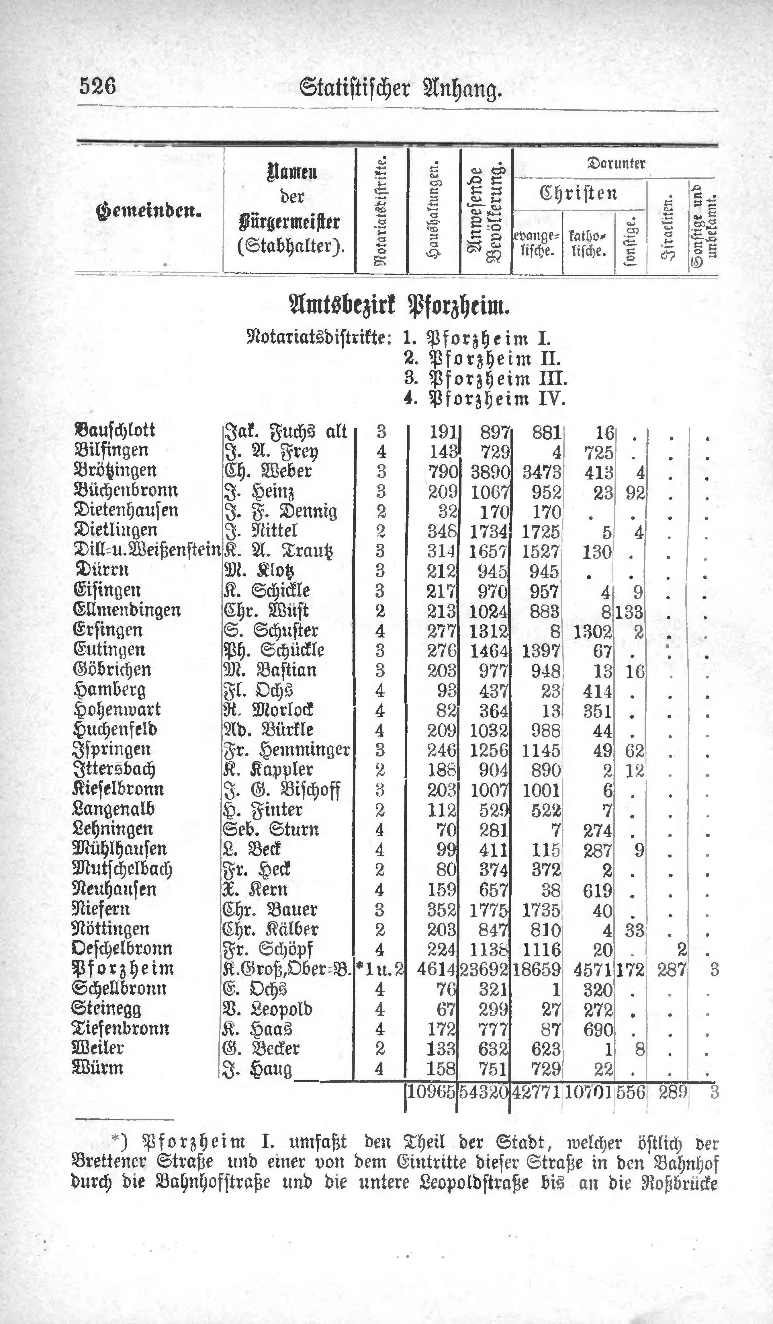 : ''Pforzheim II'' umfaßt den im Distrikt I nicht inbegriffenen Theil der Stadt.</ref> 1 u.2 || 4614 || 23692 || 18659 || 4571 || 172 || 287 || 3 | |||
