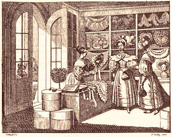 Die im 18. Jahrhundert in Mode grkommenen feinen Strohhüte der Damenwelt wurden verziert mit Bändern unterschiedlicher Farben und mit künstlichen Blumen, welche als Zubehör im [[Galanteriewaren|Galanteriewarenhandel]] zu beziehen und aus Gaze oder Seide angefertigt waren. | Die im 18. Jahrhundert in Mode grkommenen feinen Strohhüte der Damenwelt wurden verziert mit Bändern unterschiedlicher Farben und mit künstlichen Blumen, welche als Zubehör im [[Galanteriewaren|Galanteriewarenhandel]] zu beziehen und aus Gaze oder Seide angefertigt waren. | ||