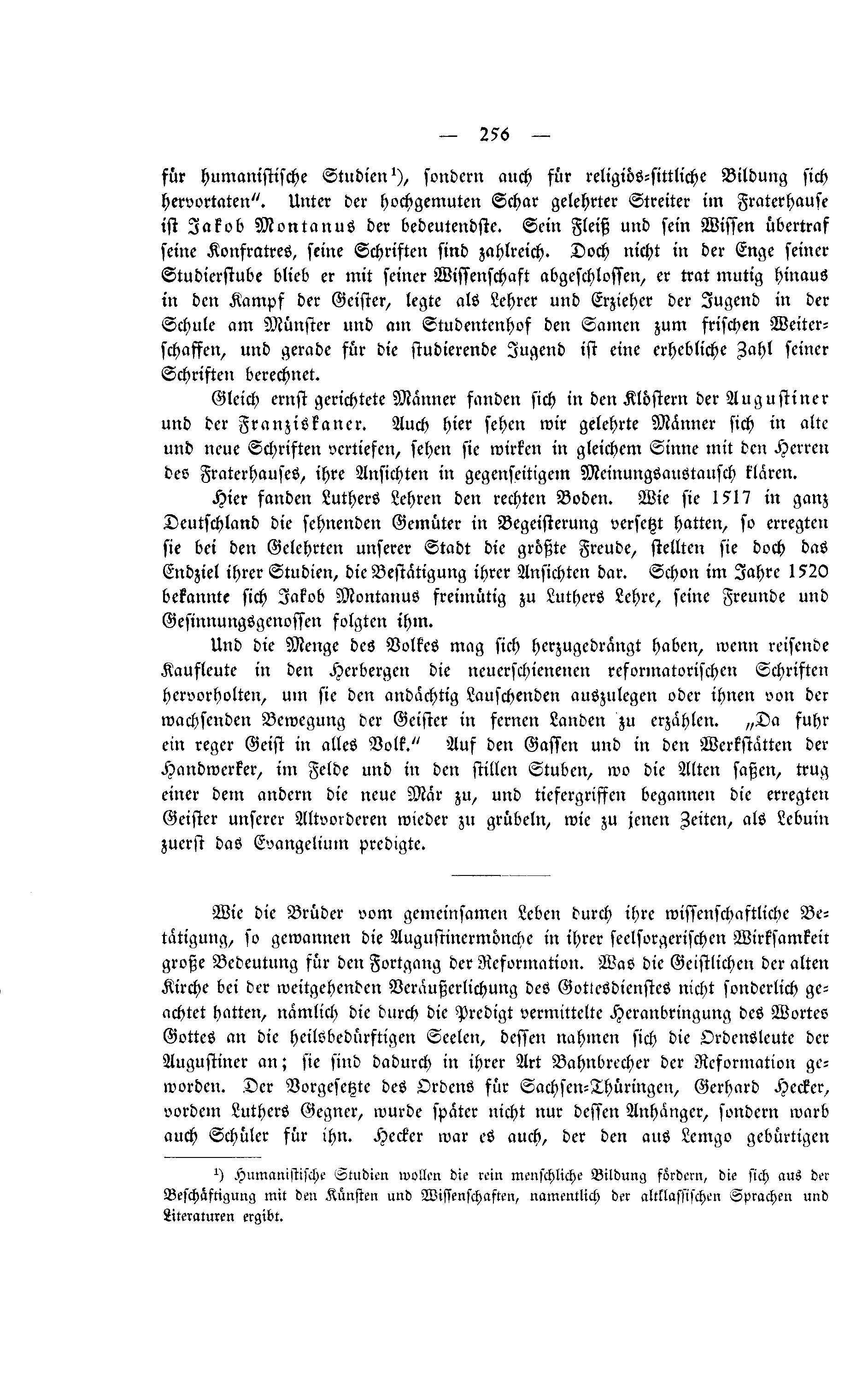 für humanistische Studien <ref>Humanistische Studien wollen die rein menschliche Bildung fördern, die sich aus der Beschäftigung mit den Künsten und Wissenschaften, namentlich der altklassischen Sprachen und Literaturen ergibt.</ref>, sondern auch für religiös-sittliche Bildung sich hervortaten“. Unter der hochgemuten Schar gelehrter Streiter im Fraterhause ist Jakob Montanus der bedeutendste. Sein Fleiß und sein Wissen übertraf seine Konfratres, seine Schriften sind zahlreich. Doch nicht in der Enge seiner Studierstube blieb er mit seiner Wissenschaft abgeschlossen, er trat mutig hinaus in den Kampf der Geister, legte als Lehrer und Erzieher der Jugend in der Schule am Münster und am Studentenhof den Samen zum frischen Weiterschaffen, und gerade für die studierende Jugend ist eine erhebliche Zahl seiner Schriften berechnet. | |||