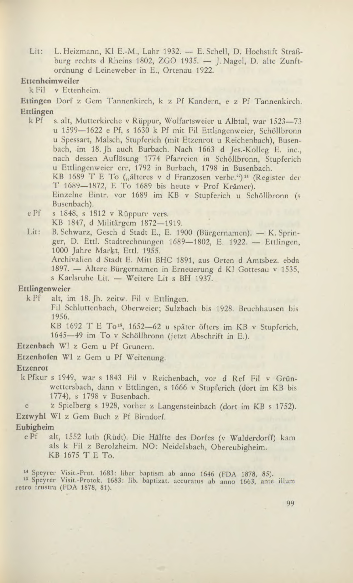 | Lit: | B.Schwarz, Gesch d Stadt E., E. 1900 (Bürgernamen). – K.Springer, D. Ettl. Stadtrechnungen 1689–1802, E. 1922. – Ettlingen, 1000 Jahre Markt, Ettl. 1955. | |