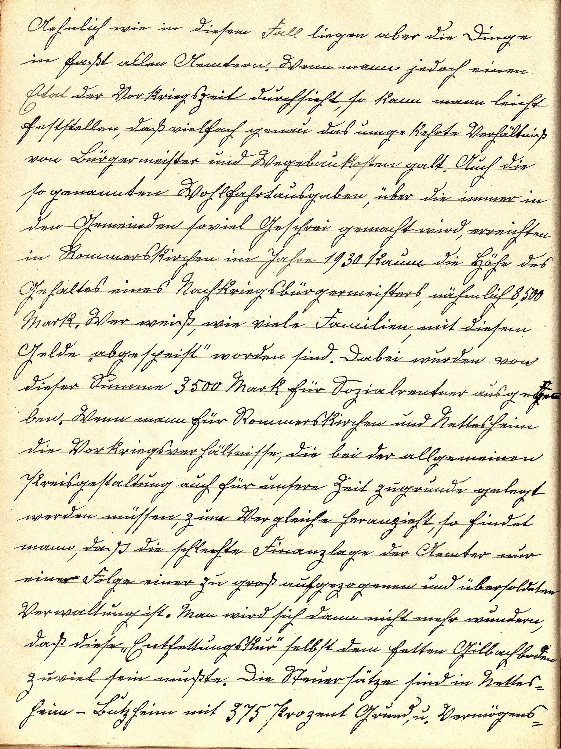 Aehnlich wie in diesem Fall liegen aber die Dinge in fa[ß]st allen Aemtern. Wenn man jedoch einen Etat der Vorkriegszeit durchsieht, so kann man leicht feststellen, daß vielfach genau das umgekehrte Verhältniß von Bürgermeister und Wegebaukosten galt. Auch die sogenannten Wohlfahrtsausgaben, über die immer in den Gemeinden soviel Geschrei gemacht wird, erreichten in Rommerskirchen im Jahr 1930 kaum die Höhe des Gehaltes eines Nachkriegsbürgermeisters, nämlich 8.500 Mark. Wer weiß, wie viele Familien mit diesem Gelde abgespeist worden sind. Dabei wurden von dieser Summe 3500 Mark für Sozialrentner ausgegeben. Wenn mann für Rommerskirchen und Nettesheim die Vorkriegsverhältnisse, die bei der allgemeinen Preisgestaltung auch für unsere Zeit zugrunde gelegt werden müssen, zum Vergleiche heranzieht, so findet mann, daß die schlechte Finanzlage der Aemter nur eine Folge einer zu groß aufgezogenen und übersoldeten Verwaltung ist. Man wird sich dann nicht mehr wundern, daß diese „Entfettungskur“ selbst dem fetten Gilbachboden zuviel sein mußte. Die Steuersätze sind in Nettesheim-Butzheim mit 375 Prozent Grund und Vermögens-