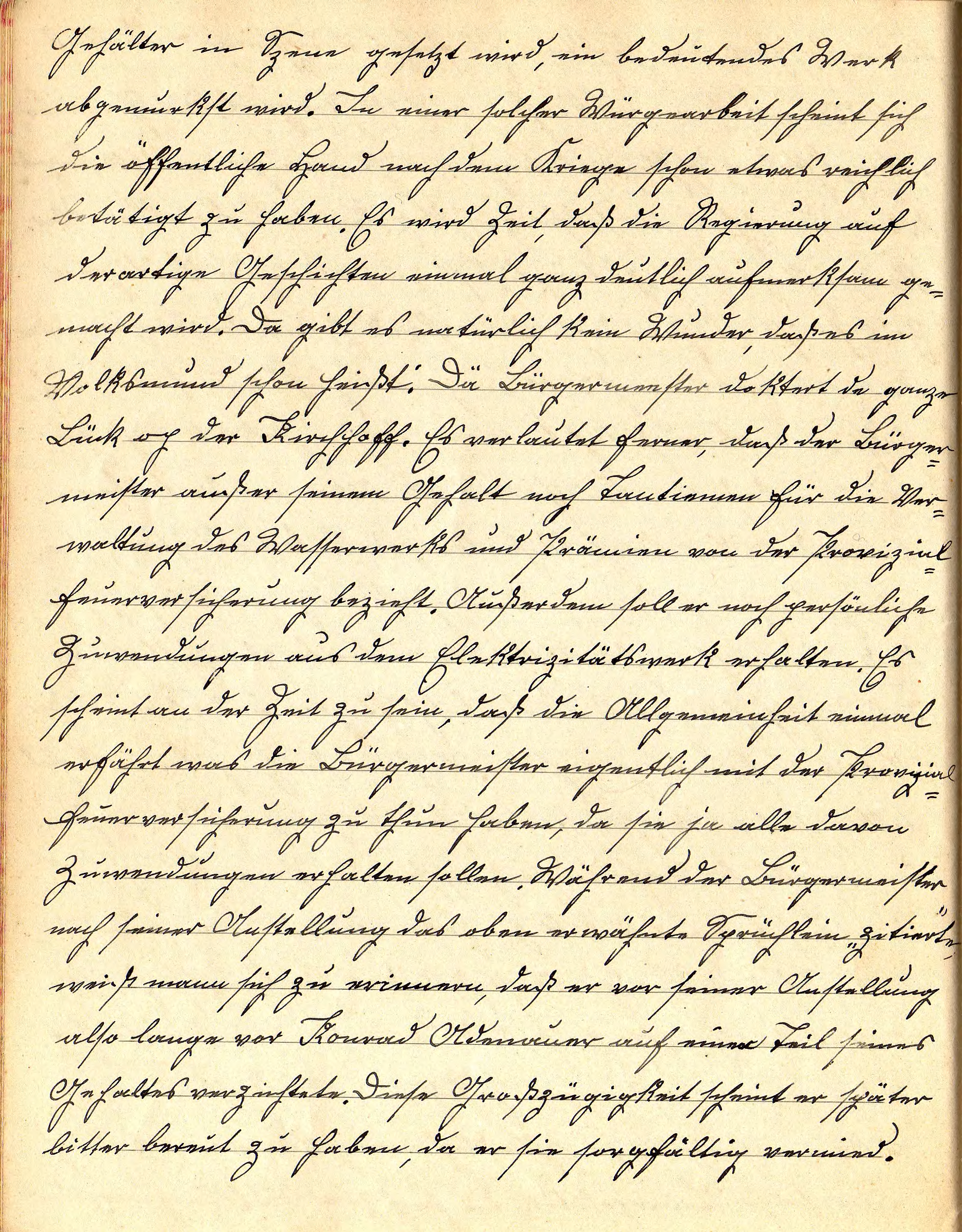 Gehälter in Szene gesetzt wird, ein bedeutendes Werk abgemurkst wird. In einer solchen Würgearbeit scheint sich die öffentliche Hand nach dem Kriege schon etwas reichlich betätigt zu haben. Es wird Zeit, daß die Regierung auf derartige Geschichten einmal ganz deutlich aufmerksam gemacht wird. Da gibt es natürlich kein Wunder, daß es im Volksmund schon heißt: Dä Bürgermeester doktert de ganze Lück op der Kirchhoff. Es verlautet ferner, daß der Bürgermeister außer seinem Gehalt noch Tantiemen für die Verwaltung des Wasserwerks und Prämien von der Provinzialfeuerversicherung bezieht. Außerdem soll er noch persönliche Zuwendungen aus dem Elektrizitätswerk erhalten. Es scheint an der Zeit zu sein, daß die Allgemeinheit einmal erfährt was die Bürgermeister eigentlich mit der Provinzialfeuerversicherung zu thun haben, da sie ja alle davon Zuwendungen erhalten sollen. Während der Bürgermeister nach seiner Anstellung das oben erwähnte Sprüchlein zitierte, weiß mann sich zu erinnern, daß er vor seiner Anstellung also lange vor Konrad Adenauer auf einen Teil seines Gehaltes verzichtete. Diese Großzügigkeit scheint er später bitter bereut zu haben, da er sie sorgfältig vermied.