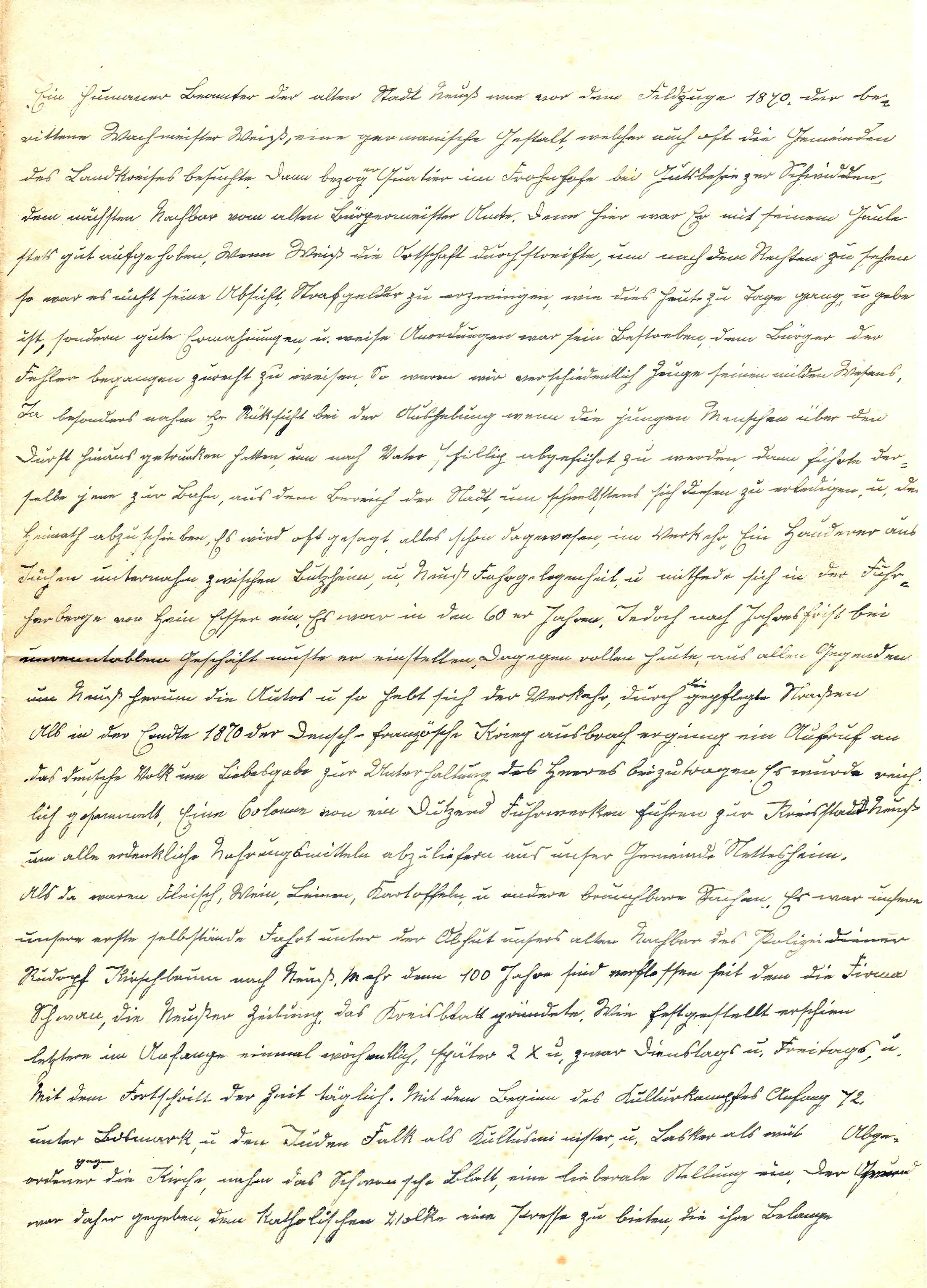 Als in der Ernte 1870 der deutsch–französische Krieg ausbrach, erging ein Aufruf an das deutsche Volk um Liebesgabe(n) zur Unterhaltung des Heeres beizutragen. Es wurde reichlich gesammelt. Eine Colonne von ein Dutzend Fuhrwerken fuhren zur Kreisstadt Neuss, um alle erdenkliche(n) Nahrungsmitteln abzuliefern aus unserer Gemeinde Nettesheim. Als da waren, Fleisch, Wein, Leinen, Kartoffeln, u. andere brauchbare Sachen. Es war unsere unsere (sic!) erste selbstständ(ig)e Fahrt unter der Obhut unsers alten Nachbar(n) des Polizeidiener(s) Rudo(l)ph Kirschbaum nach Neuss. Mehr denn 100 Jahre sind verflossen seitdem die Firma Schwan, die Neußer Zeitung, das Kreisblatt gründete. Wie festgestellt erschien letzte im Anfange einmal wöchentlich, später 2 x u. zwar Dienstags und Freitags, u. mit dem Fortschritt der Zeit täglich. Mit dem Beginn des Kulturkampfes Anfang 72 unter Bismarck, u. den Juden Falk als Kultusminister, u. Basker als wüt___ Abgeordneter gegen die Kirche, nahm das Schwansche Blatt, eine liberale Stellung ein. Der Grund war daher gegeben, dem katholischen Volke eine Presse zu bieten, die ihre Belange …..