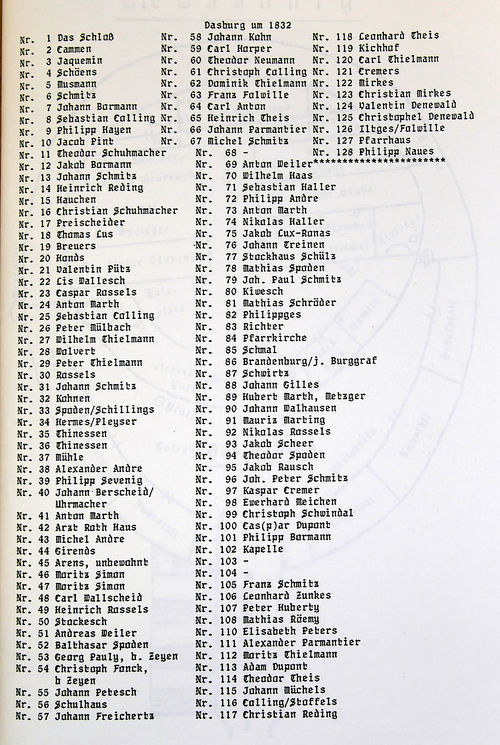 In seinem I.Band von 1835 der Allgemeinen Pfarrgeschichte der Pfarrei Daleiden und der umliegenden Pfarreien sowie Herrschaft Dasburg von ihrem Entstehen bis 1830 zeigt Pfarrer Michel Bormann diese Listen und Karten. | [[Datei:Einwohner-Dasburg 1832 Index.JPG|thumb|500px|left|Die Einwohneliste von Dasburg]] | ||