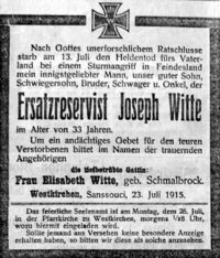 [[Datei:TA-BVZ-1915 JosephWitte.JPG|thumb| | [[Datei:TA-BVZ-1915 JosephWitte.JPG|thumb|200px|Todesanzeige der Beckumer Vorkszeitung]] | ||