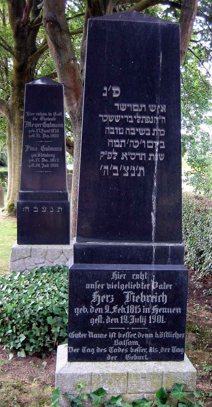 <tab head="top" class="wikitable sortable" width="800"> Name, Vorname geborene Geboren am / Alter Gestorben am Bacharach, Betti Schönholz 04.03.1885 Bacharach, Perez 10.01.1810 18.01.1862 Bacharach, Peritz 16.09.1850 09.03.1858 Cohn, Bella Amberg 100 Jahre 21.09.1889 Cohn, Chomann 89 Jahre 27.10.1871 Cohn, Ester 01.11.1821 04.11.1898 Edler, Henriette Gutmann 07.04.1841 21.02.1887 Gutmann, Lina Steinberg 27.12 1842 20.07.1900 Gutmann, Meyer 27.06.1830 21.12.1900 Liebreich, Henriette Leffmann 02.01.1849 09.09.1925 Liebreich, Herz 02.02.1815 12.07.1901 Liebreich, Levi 10.10.1848 30.05.1921 Löwenbach, Clara Cohn 04.03.1824 16.07.1892 Löwenbach, Dina 26.04.1853 18.03.1937 Löwenbach, Pauline 20.01.1860 07.01.1924 Löwenbach, Rika 05.05.1857 12.09.1914 Löwenstein, Benny 08.06.1862 21.01.1931 Löwenstein, Hendel Engländer 79 Jahre 04.12.1874 Löwenstein, Henriette Schuster 22.02.1835 27.05.1866 Löwenstein, Henriette Heine 24.03.1846 07.07.1919 Löwenstein, Joseph (vermutlich) Löwenstein, Moses 18.10.1832 25.11.1899 Schriftplatte fehlt! Schriftplatte fehlt! Schriftplatte fehlt! Silberberg, Julius 13.08.1903 19.03.1926 Silberberg, Levi ? (Grabstein 24 verschwunden) Silberberg, Rika Leffmann 16.07.1854 04.11.1914 Stern, Josef (gest. 1941) Stern, Sophie Gutmann 28.11.1873 06.05.1937 </tab>