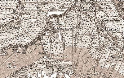 [[Bild:Woestenlande1805.jpg|thumb|400px|'''Neuenhuntorf an der Hunte, zwischen Holle und Berne "''' <br/> Topographische Karte -Westfalen (1805) von Le Coq (genordet)]] | |||