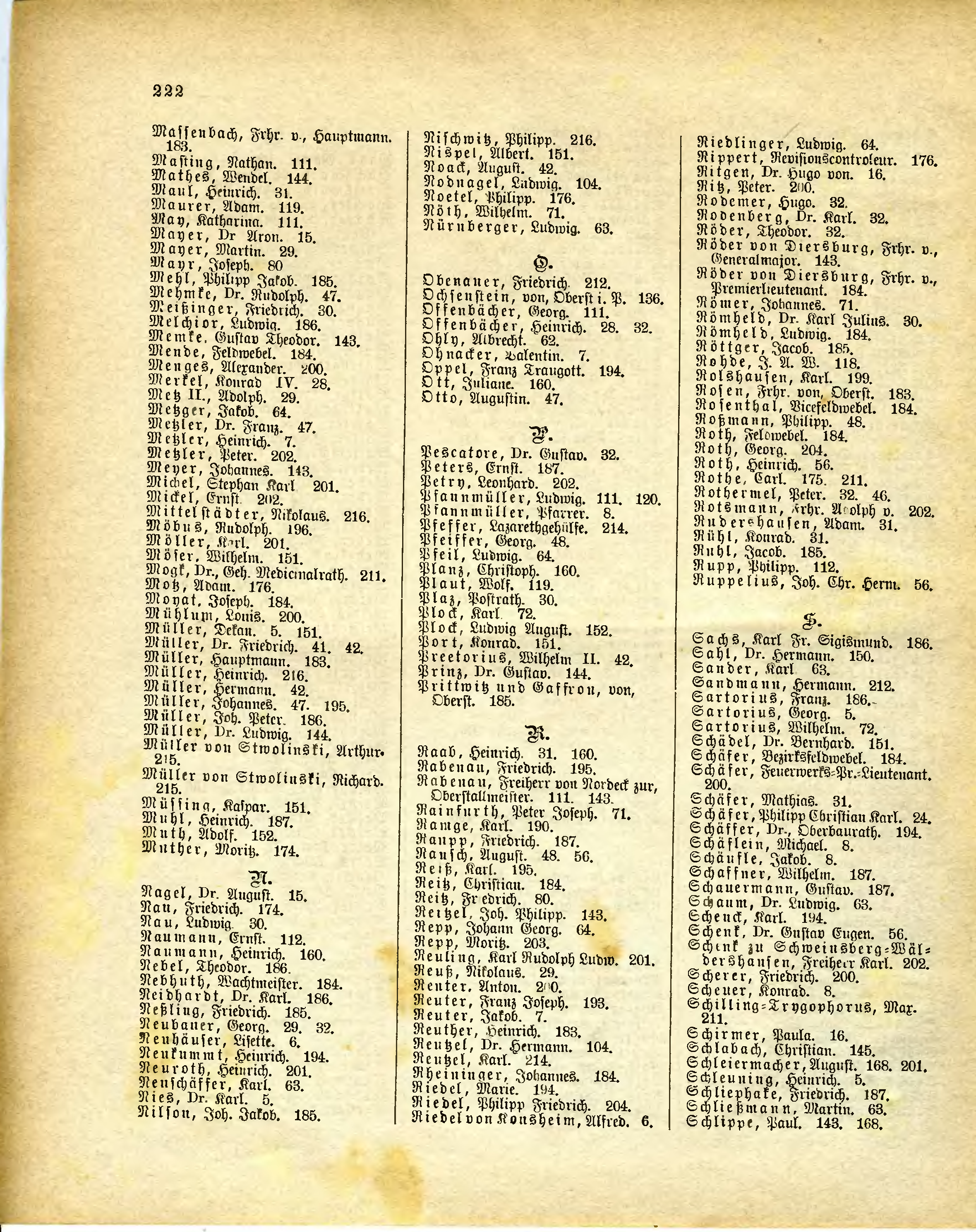 '''Massenbach''', Frhr. v., Hauptmann. [[../B183|B183]].<br />'''Masting''', Nathan. [[../B111|B111]].<br />'''Mathes''', Wendel. [[../B144|B144]].<br />'''Maul''', Heinrich. [[../B031|B031]].<br />'''Maurer''', Adam. [[../B119|B119]].<br />'''May''', Katharina. [[../B111|B111]].<br />'''Mayer''', Dr Aron. [[../B015|B015]].<br />'''Mayer''', Martin. [[../B029|B029]].<br />'''Mayr''', Joseph. [[../B080|B080]].<br />'''Mehl''', Philipp Jakob. [[../B185|B185]].<br />'''Mehmke''', Dr. Rudolph. [[../B047|B047]].<br />'''Meißinger''', Friedrich. [[../B030|B030]].<br />'''Melchior''', Ludwig. [[../B186|B186]].<br />'''Memke''', Gustav Theodor. [[../B143|B143]].<br />'''Mende''', Feldwebel. [[../B184|B184]].<br />'''Menges''', Alexander. [[../B200|B200]].<br />'''Merkel''', Konrad lV. [[../B028|B028]].<br />'''Metz''' II., Adolph. [[../B029|B029]].<br />'''Metzger''', Jakob. [[../B064|B064]].<br />'''Metzler''', Dr. Franz. [[../B047|B047]].<br />'''Metzler''', Heinrich. [[../B007|B007]].<br />'''Metzler''', Peter. [[../B202|B202]].<br />'''Meyer''', Johannes. [[../B143|B143]].<br />'''Michel''', Stephan Karl [[../B201|B201]].<br />'''Mickel''', Ernst. [[../B202|B202]].<br />'''Mittelstädter''', Nikolaus. [[../B216|B216]].<br />'''Möbus''', Rudolph. [[../B196|B196]].<br />'''Möller''', Karl. [[../B201|B201]].<br />'''Möser''', Wilhelm. [[../B151|B151]].<br />'''Mogk''', Dr., Geh. Medicinalrath. [[../B211|B211]].<br />'''Motz''', Adam. [[../B176|B176]].<br />'''Moyat''', Joseph. [[../B184|B184]].<br />'''Mühlum''', Luuis. [[../B200|B200]].<br />'''Müller''', Dekan. [[../B005|B005]]. [[../B151|B151]].<br />'''Müller''', Dr. Friedrich. [[../B041|B041]]. [[../B042|B042]].<br />'''Müller''', Hauptmann. [[../B183|B183]].<br />'''Müller''', Heinrich. [[../B216|B216]].<br />'''Müller''', Hermann. [[../B042|B042]].<br />'''Müller''', Johannes. [[../B047|B047]]. [[../B195|B195]].<br />'''Müller''', Joh. Peter. [[../B186|B186]].<br />'''Müller'''. Dr. Ludwig. [[../B144|B144]].<br />'''Müller von Stwolinski''', Arthur. [[../B215|B215]].<br />'''Müller von Stwolinski''', Richard. [[../B215|B215]].<br />'''Müssing''', Kaspar. [[../B151|B151]].<br />'''Muhl''', Heinrich. [[../B187|B187]].<br />'''Muth''', Adolf. [[../B152|B152]].<br />'''Muther''', Moritz. [[../B174|B174]].<br /><br /> | |||
