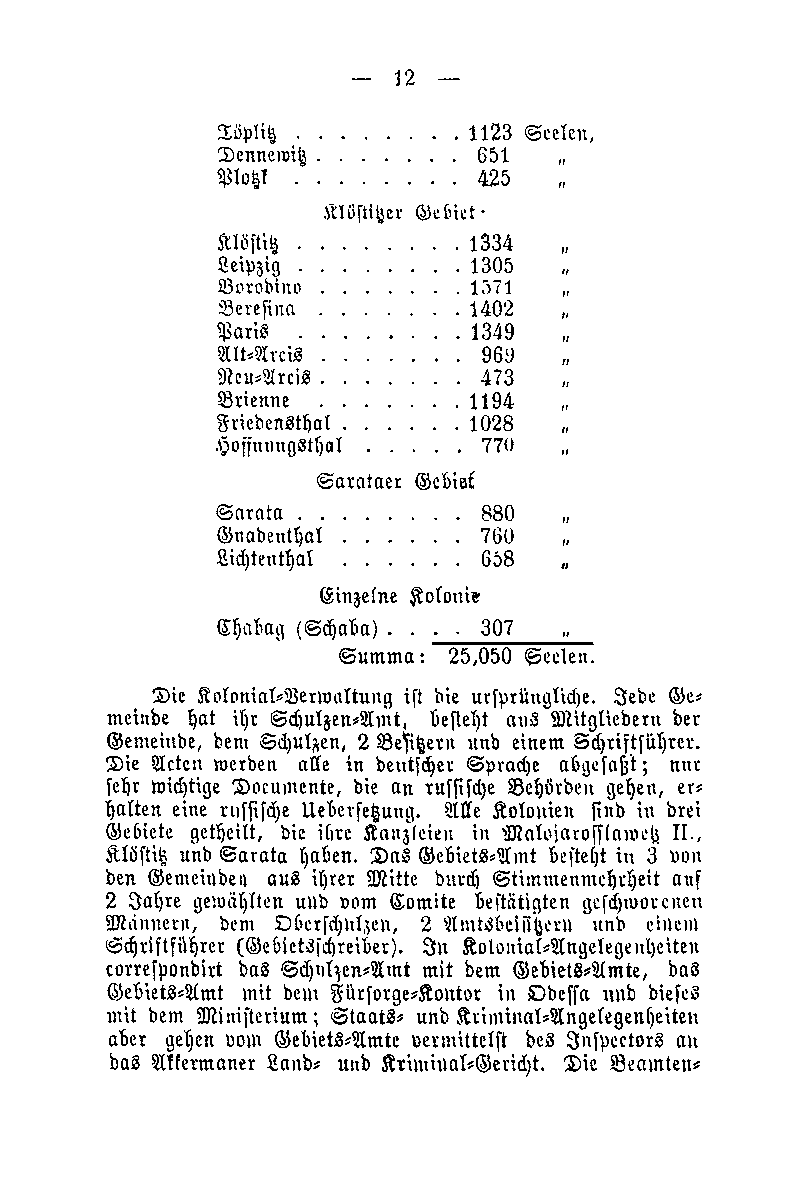 Die Kolonial-Verwaltung ist die ursprüngliche. Jede Gemeine hat ihr Schulzen-Amt, besteht aus Mitgliedern der Gemeinde, dem Schulzen, 2 Beisitzern und einem Schriftführer. Die Acten werden alle in deutscher Sprache abgefaßt; nur sehr wichtige Documente, die an die russische Behörden gehen, erhalten eine russische Übersetzung. Alle Kolonien sind in drei Gebiete getheilt, die ihre Kanzleien in Malojarosslawetz II. , Klöstitz und Sarata haben. Das Gebiets-Amt besteht in 3 von den Gemeinden aus ihrer Mitte durch Stimmenmehrheit auf 2 Jahre gewählten und vom Comite bestätigten geschworenen Männern, dem Oberschulzen, 2 Amtsbeisitzern und einem Schriftführer (Gebietsschreiber). In Kolonial-Angelegenheiten correspondirt das Schulzen-Amt mit dem Gebiets-Amte, das Gebiets-Amt mit dem Fürsorge-Kontor in Odessa und dieses mit dem Ministerium; Staats- und Kriminal-Angelegenheiten aber gehen vom Gebiets-Amte vermittelst des Inspectors an das Akkermaner Land- und Kriminal-Gericht. Die Beamten-