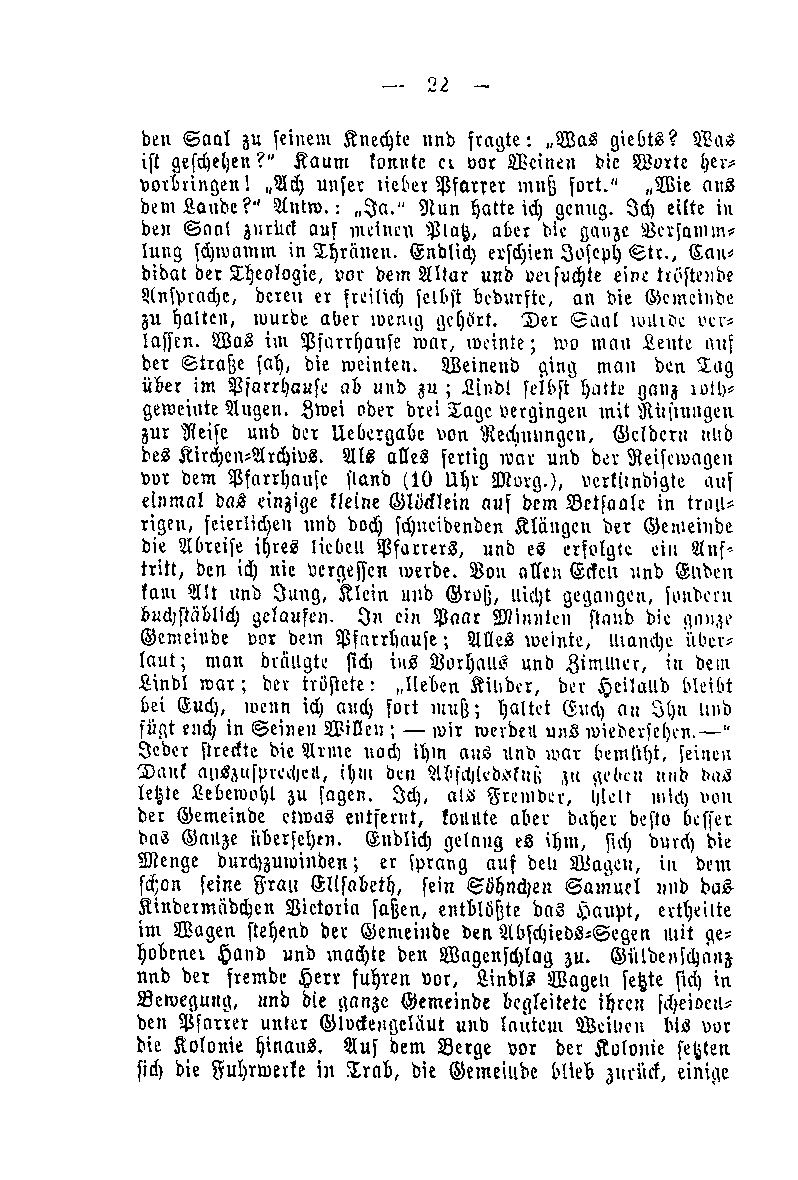 den Saal zu seinem Knechte und fragte: "Was giebts? Was ist geschehen?" Kaum konnte er vor Weinen die Worte hervorbringen! "Ach unser lieber Pfarrer muß fort." "Wie aus dem Lande?" Antw.: "Ja." Nun hatte ich genug. Ich eilte in den Saal zurück auf meinen Platz, aber die ganze Versammlung schwamm in Thränen. Endlich erschien Joseph Str., Candidat der Theologie, vor dem Altar und versuchte eine tröstende Ansprache, deren er freilich selbst bedurfte, an die Gemeinde zu halten, wurde aber wenig gehört. Der Saal wurde verlassen. Was im Pfarrhause war, weinte; wo man Leute auf der Straße sah, die weinten. Weinend ging man den Tag über im Pfarrhause ab und zu; Lindl selbst hatte ganz rothgeweinte Augen. Zwei oder drei Tage vergingen mit Rüstungen zur Reise und der Übergabe von Rechnungen, Geldern und des Kirchen-Archivs. Als alles fertig war und der Reisewagen vor dem Pfarrhause Stand (10 Uhr Morg.), verkündigte auf einmal das einzige kleine Glöcklein auf dem Betsaale in traurigen, feierlichen und doch schneidenden Klängen der Gemeinde die Abreise ihres lieben Pfarrers, und es erfolgte ein Auftritt, den ich nie vergessen werde. Von allen Ecken und Enden kam Alt und Jung, Klein und Groß, nicht gegangen, sondern buchstäblich gelaufen. In ein Paar Minuten stand die ganze Gemeinde im Pfarrhause; Alles weinte, manche überlaut; man drängt sich ins Vorhaus und Zimmer, in dem Lindl war; der tröstete: "lieben Kinder, der Heiland bleibt bei Euch, wenn ich auch fort muß; haltet Euch an Ihn und fügt euch in seinen Willen; - wir werden uns wiedersehen. –" Jeder streckte die Arme nach ihm aus und war bemüht, seinen Dank auszusprechen, ihm den Abschiedskuß zu geben und das letzte Lebewohl zu sagen. Ich, als Fremder, hielt mich von der Gemeinde etwas entfernt, konnte aber daher desto besser das Ganze übersehen. Endlich gelang es ihm, sich durch die Menge durchzuwinden; er sprang auf den Wagen, indem schon seine Frau Elisabeth, sein Söhnchen Samuel und das Kindermädchen Victoria saßen, entblößte das Haupt, ertheilte im Wagen stehend der Gemeinde den Abschieds-Segen mit gehobener Hand und machte den Wagenschlag zu. Güldenschanz und der fremde Herr fuhren vor, Lindls Wagen setzte sich in Bewegung, und die ganze Gemeinde begleitete ihren scheidenden Pfarrer unter Glockengeläut und lautem Weinen bis vor die Kolonie hinaus. Auf dem Berge vor der Kolonie setzten sich die Fuhrwerke in Trab, die Gemeinde blieb zurück, einige