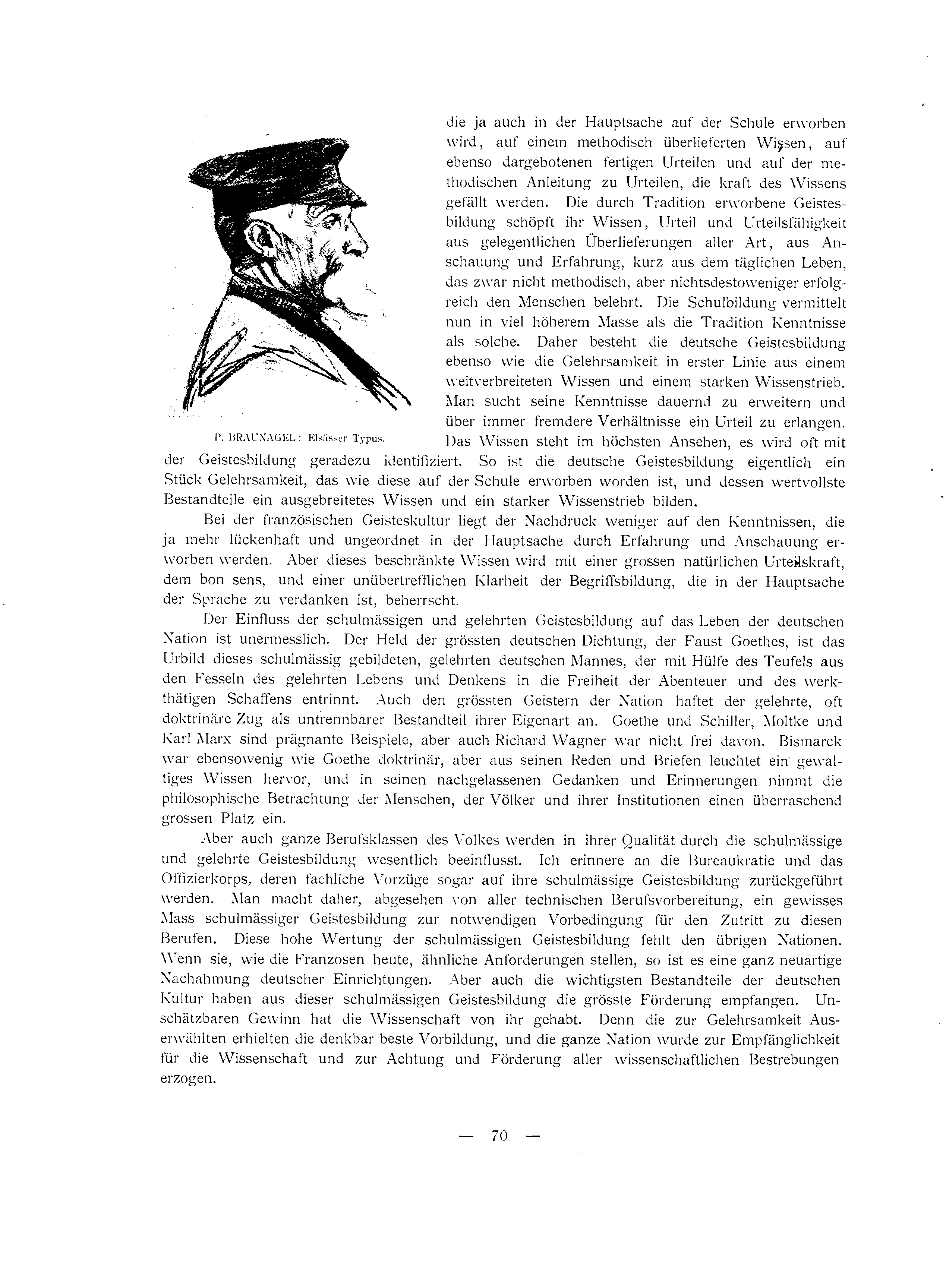Aber auch ganze Berufsklassen des Volkes werden in ihrer Qualität durch die schulmässige und gelehrte Geistesbildung wesentlich beeinflusst. Ich erinnere an die Bureaukratie und das Offizierkorps, deren fachliche Vorzüge sogar auf ihre schulmässige Geistesbildung zurückgeführt werden. Man macht daher, abgesehen von aller technischen Berufsvorbereitung, ein gewisses Mass schulmässiger Geistesbildung zur notwendigen Vorbedingung für den Zutritt zu diesen Berufen. Diese hohe Wertung der schulmässigen Geistesbildung fehlt den übrigen Nationen. Wenn sie, wie die Franzosen heute, ähnliche Anforderungen stellen, so ist es eine ganz neuartige Nachahmung deutscher Einrichtungen. Aber auch die wichtigsten Bestandteile der deutschen Kultur haben aus dieser schulmässigen Geistesbildung die grösste Förderung empfangen. Unschätzbaren Gewinn hat die Wissenschaft von ihr gehabt. Denn die zur Gelehrsamkeit Auserwählten erhielten die denkbar beste Vorbildung, und die ganze Nation wurde zur Empfänglichkeit für die Wissenschaft und zur Achtung und Förderung aller wissenschaftlichen Bestrebungen erzogen. | Aber auch ganze Berufsklassen des Volkes werden in ihrer Qualität durch die schulmässige und gelehrte Geistesbildung wesentlich beeinflusst. Ich erinnere an die Bureaukratie und das Offizierkorps, deren fachliche Vorzüge sogar auf ihre schulmässige Geistesbildung zurückgeführt werden. Man macht daher, abgesehen von aller technischen Berufsvorbereitung, ein gewisses Mass schulmässiger Geistesbildung zur notwendigen Vorbedingung für den Zutritt zu diesen Berufen. Diese hohe Wertung der schulmässigen Geistesbildung fehlt den übrigen Nationen. Wenn sie, wie die Franzosen heute, ähnliche Anforderungen stellen, so ist es eine ganz neuartige Nachahmung deutscher Einrichtungen. Aber auch die wichtigsten Bestandteile der deutschen Kultur haben aus dieser schulmässigen Geistesbildung die grösste Förderung empfangen. Unschätzbaren Gewinn hat die Wissenschaft von ihr gehabt. Denn die zur Gelehrsamkeit Auserwählten erhielten die denkbar beste Vorbildung, und die ganze Nation wurde zur Empfänglichkeit für die Wissenschaft und zur Achtung und Förderung aller wissenschaftlichen Bestrebungen erzogen. | ||