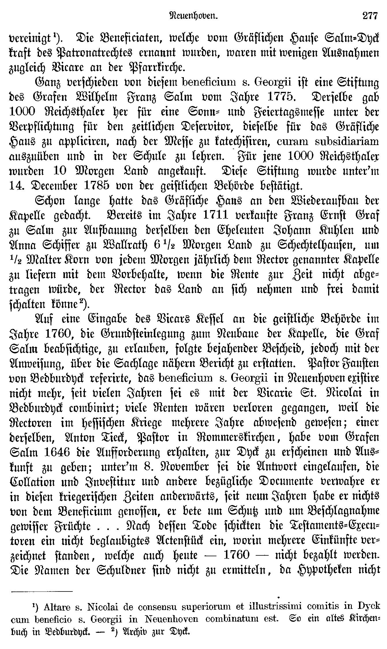 Auf eine Eingabe des Vicars Kessel an die geistliche Behörde im Jahre 1760, die Grundsteinlegung zum Neubaue der Kapelle, die Graf Salm beabsichtige, zu erlauben, folgte bejahender Bescheid, jedich mit der Anweisung, über die Sachlage nähern Bericht zu erstatten. Pastor Fausten von Bedburdyck referirte, das <tt>beneficium s. Georgii</tt> in Neuenhoven existire nicht mehr, seit vielen Jahren sei es mit der Vicarie St. Nicolai in Bedburdyck combinirt; viele Renten wären verloren gegangen, weil die Rectoren im hessischen Kriege mehrere Jahre abwesend gewesen; einer derselben, Anton Tieck, Pastor in Rommerskirchen, habe vom Grafen Salm 1646 die Aufforderung erhalten, zur Dyck zu erscheinen und Auskunft zu geben; unter'm 8. November sei die Antwort eingelaufen, die Collation und Investitur und andere bezügliche Documente verwahre er in diesen kriegerischen Zeiten anderwärts, seit neun Jahren habe er nichts von dem Beneficium genossen, er bete um Schutz und um Beschlagnahme gewisser Früchte … Nach dessen Tode schickten die Testaments=Executoren ein nicht beglaubigtes Actenstück ein, worin mehrere Einkünfte verzeichnet standen, welche auch heute – 1760 – nicht bezahlte werden. Die Namen der Schuldner sind nicht zu ermitteln, da Hypotheken nicht | |||