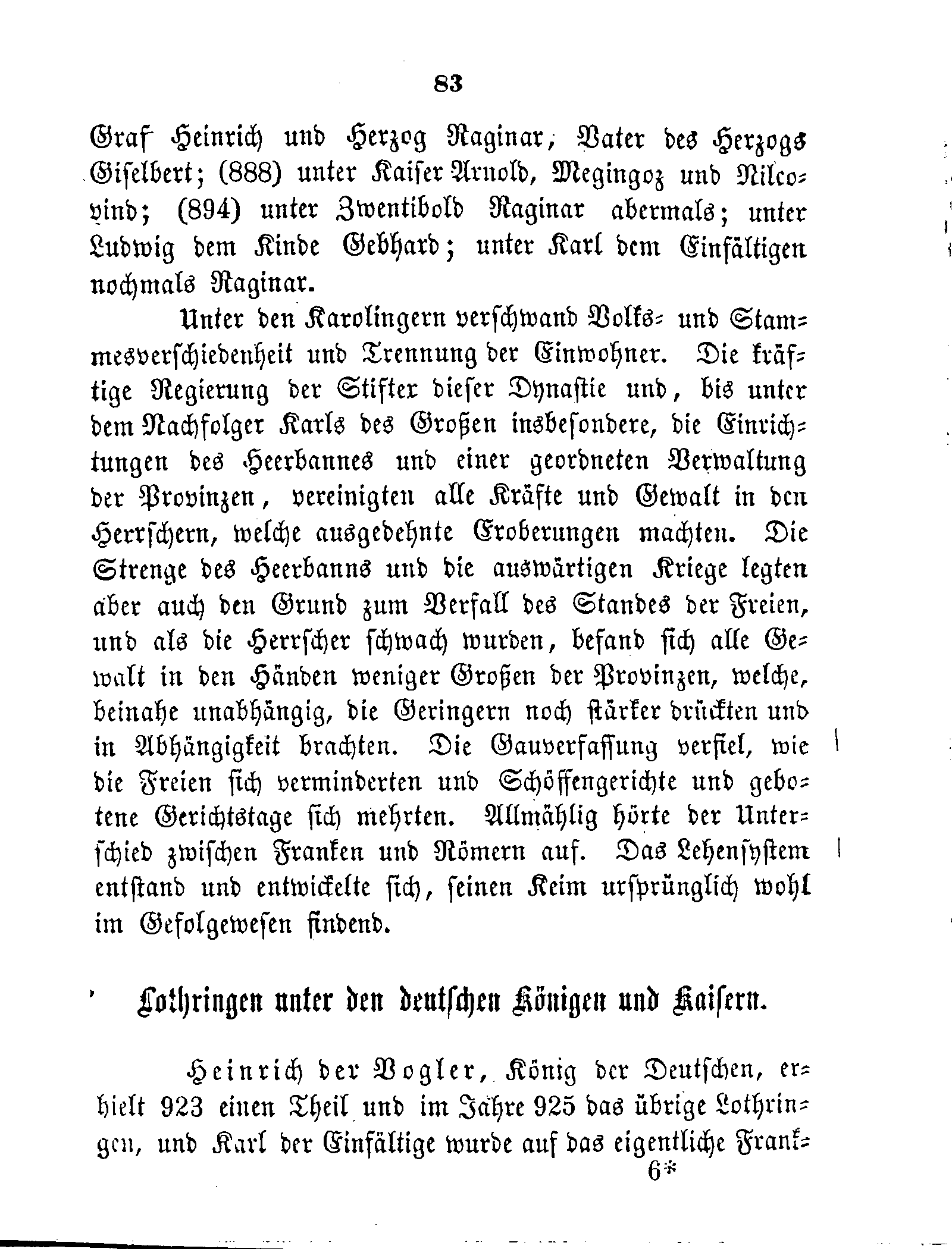 Heinrich der Vogler, König der Deutschen, erhielt 923 einen Theil und im Jahre 925 das übrige Lothringen, und Karl der Einfältige wurde auf das eigentliche Frankreich | |||