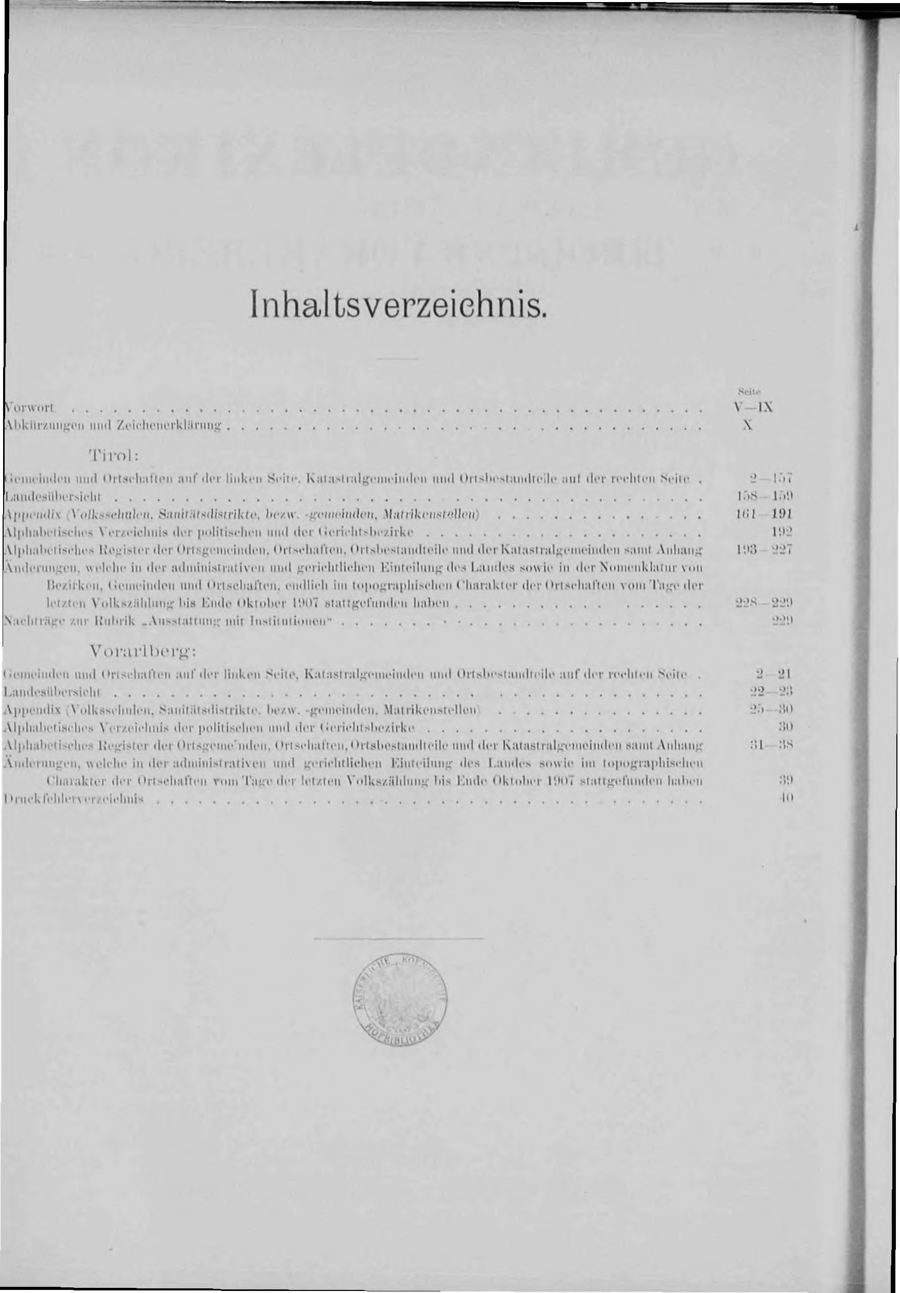 | Änderungen welche in der administrativen und gerichtlichen Einteilung des Landes sowie im topographischen Charakter der Ortschaften vom Tage der letzten Volkszählung bis Ende Oktober 1907 stattgefunden haben | 39 |