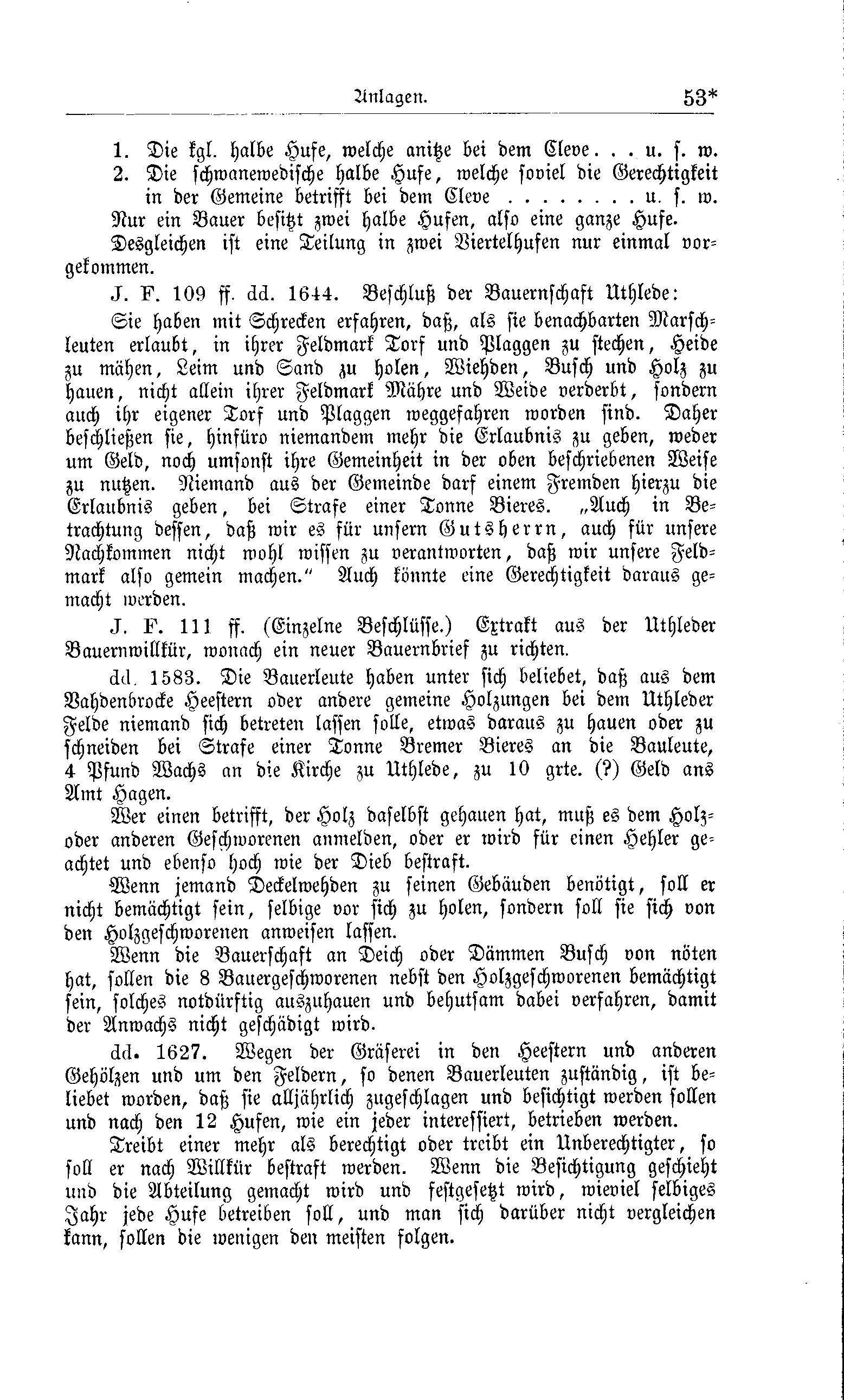 dd. 1583. Die Bauerleute haben unter sich beliebet, daß aus dem Nahdenbrocke Heestern oder andere gemeine Holzungen bei dem Uthleder Felde niemand sich betreten lassen solle, etwas daraus zu hauen oder zu schneiden bei Strafe einer Tonne Bremer Bieres an die Bauleute, 4 Pfund Wachs an die Kirche zu Uthlede, zu 10 grte. (?) Geld ans Amt Hagen.