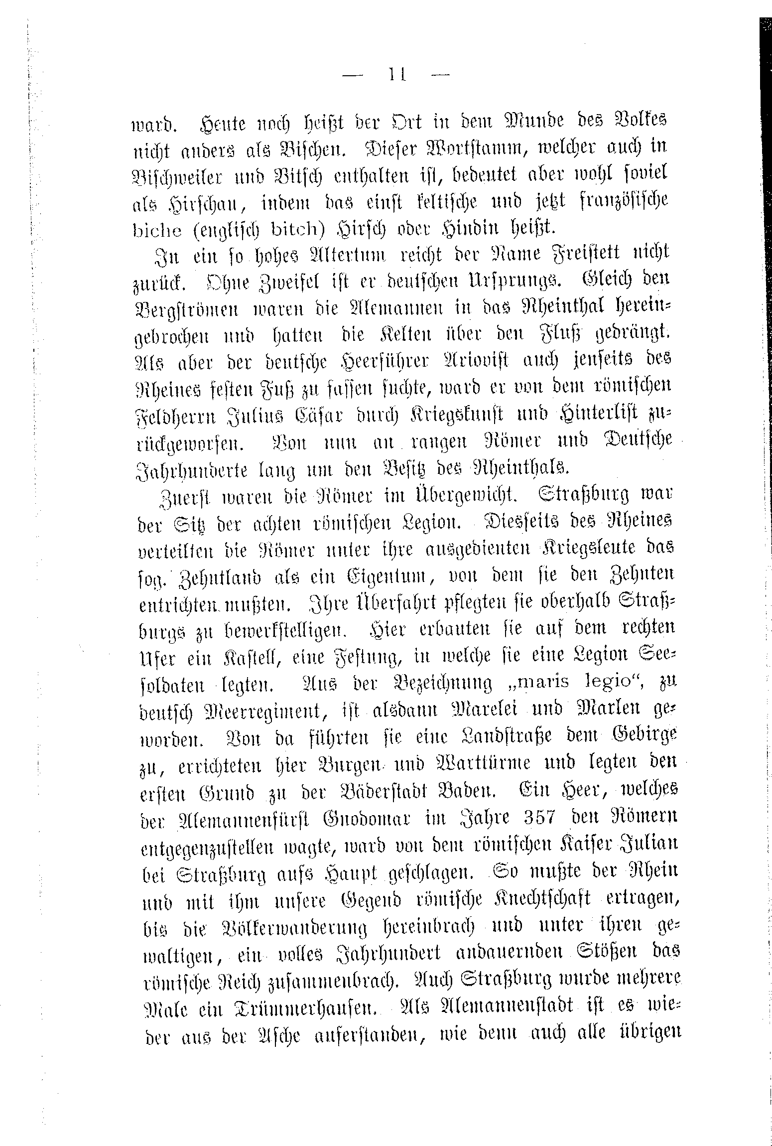 In ein so hohes Altertum reicht der Name Freistett nicht zurück. Ohne Zweifel ist er deutschen Ursprungs. Gleich den Bergströmen waren die Alemannen in das Rheinthal herein-gebrochen und hatten die Kelten über den Fluß gedrängt. Als aber der deutsche Heerführer Ariovist auch jenseits des Rheines festen Fuß zu fassen suchte, ward er von dem römischen Feldherrn Julius Cäsar durch Kriegskunst und Hinterlist zurückgeworfen. Von nun an rangen Römer und Deutsche Jahrhunderte lang um den Besitz des Rheinthals.
