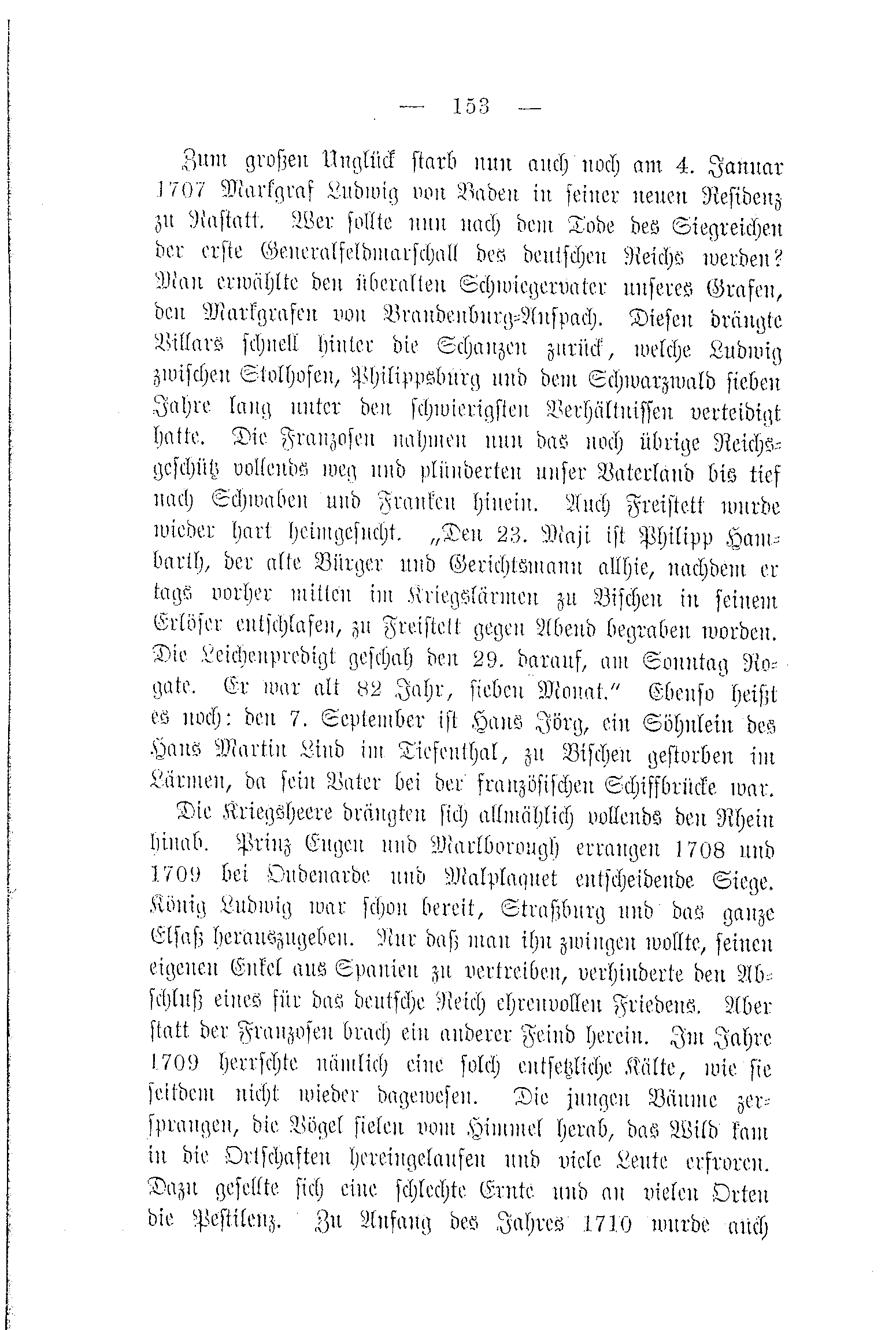Die Kriegsheere drängten sich allmählich vollends den Rhein hinab. Prinz Eugen und Marlborough errangen 1708 und 1709 bei Oudenarde und Malplaquet entscheidende Siege. König Ludwig war schon bereit, Straßburg und das ganze Elsaß herauszugeben. Nur daß man ihn zwingen wollte, seinen eigenen Enkel aus Spanien zu vertreiben, verhinderte den Abschluß eines für das deutsche Reich ehrenvollen Friedens. Aber statt der Franzosen brach ein anderer Feind herein. Im Jahre 1709 herrschte nämlich eine solch entsetzliche Kälte, wie sie seitdem nicht wieder dagewesen. Die jungen Bäume zersprangen, die Vögel fielen vom Himmel herab, das Wild kam in die Ortschaften hereingelaufen und viele Leute erfroren. Dazu gesellte sich eine schlechte Ernte und an vielen Orten die Pestilenz. Zu Anfang des Jahres 1710 wurde auch