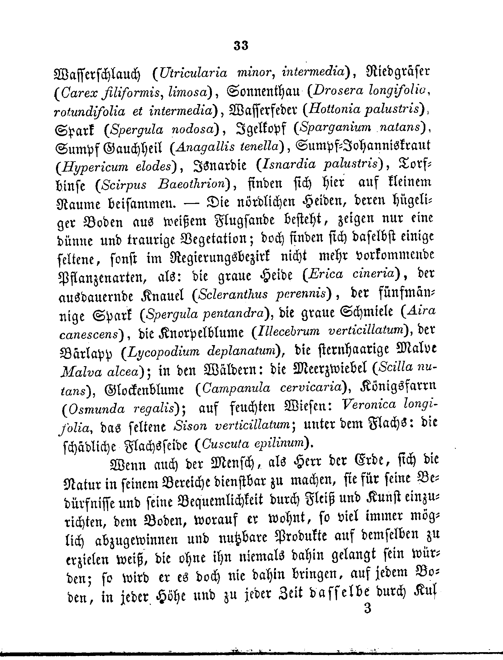 Wasserschlauch (Utricularia minor, intermedia), Riedgräser (Carex filiformis, limosa), Sonnenthau (Drosera longifolio, rotundifolia et intermedia), Wasserfeder (Hottonia palustris), Spark (Spergula nodosa), Igelkopf (Sparganium natans), Sumpf Gauchheil (Anagallis tenella), Sumpf-Johanniskraut (Hypericum elodes), Isnardie (Isnardia palustris), Torfbinse (Scirpus Baeothrion), finden sich hier auf kleinem Raume beisammen. — Die nördlichen Heiden, deren hügeliger Boden aus weißem Flugsande besteht, zeigen nur eine dünne und traurige Vegetation; doch finden sich daselbst einige seltene, sonst im Regierungsbezirk nicht mehr vorkommende Pftanzenarten, als: die graue Heide (Erica cineria), der ausdauernde Knauel (Scleranthus perennis), der fünfmännige Spark (Spergula pentandra), die graue Schmiele (Aira canescens), die Knorpelblume (Illecebrum verticillatum), der Bärlapp (Lycopodium deplanatum), die sternhaarige Malve (Malva alcea); in den Wäldern: die Meerzwiebel (Scilla nutans), Glockenblume (Campanula cervicaria), Königsfarrn (Osmunda regalis); auf feuchten Wiesen: Veronica longifolia, das seltene Sison verticillatum; unter dem Flachs: die schädliche Flachsseide (Cuscuta epilinum).