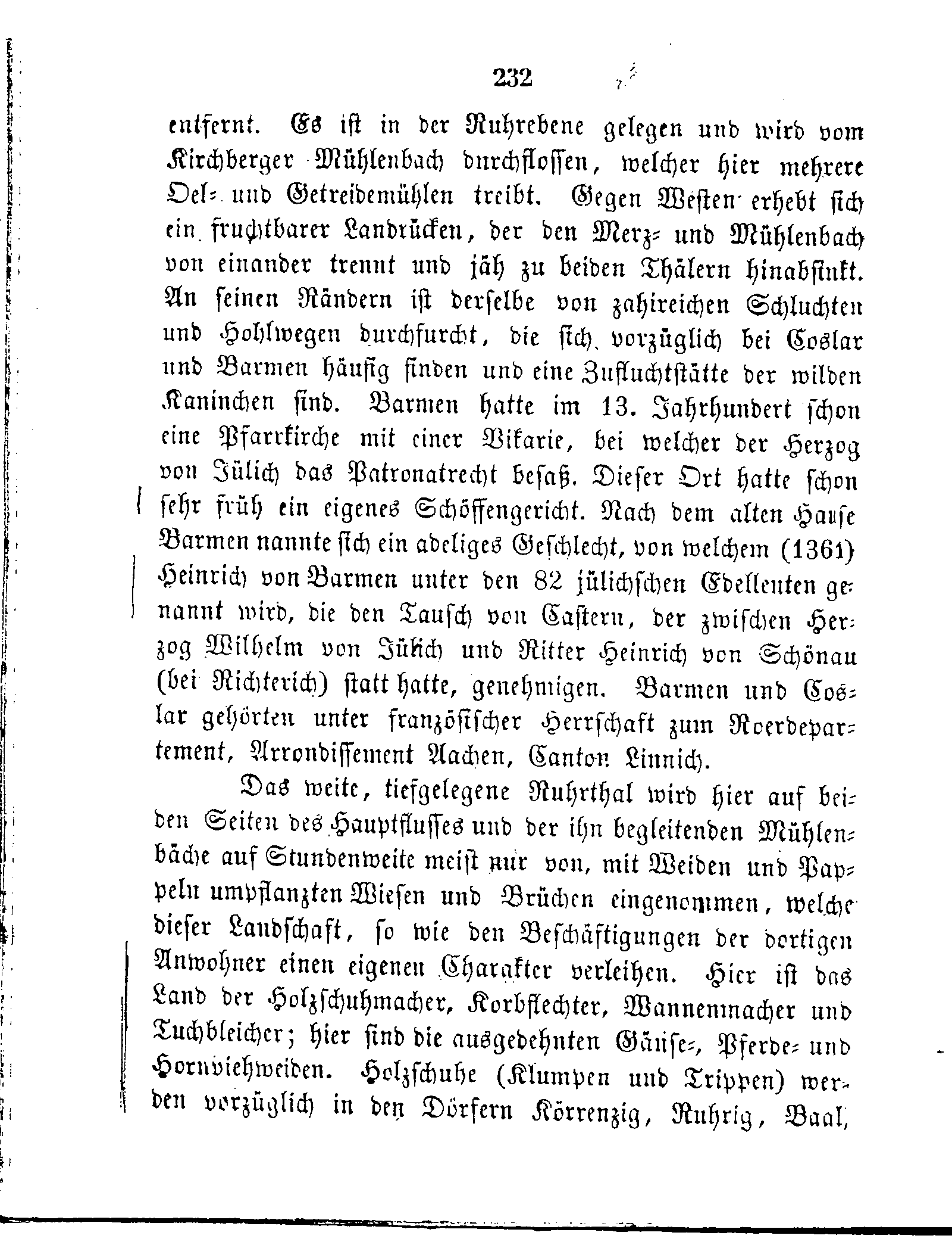 Das weite, tiefgelegene Ruhrthal wird hier auf beiden Seiten des Hauptflusses und der ihn begleitenden Mühlenbäche auf Stundenweite meist nur von, mit Weiden und Pappeln umpflanzten Wiesen und Brücken eingenommen, welche dieser Landschaft, so wie den Beschäftigungen der dortigen Anwohner einen eigenen Charakter verleihen. Hier ist das Land der Holzschuhmacher, Korbflechter, Wannenmacher und Tuchbleicher; hier sind die ausgedehnten Gänse-, Pferde- und Hornviehweiden. Holzschuhe (Klumpen und Trippen) werden vorzüglich in den Dörfern Körrenzig, Ruhrig, Baal, | |||