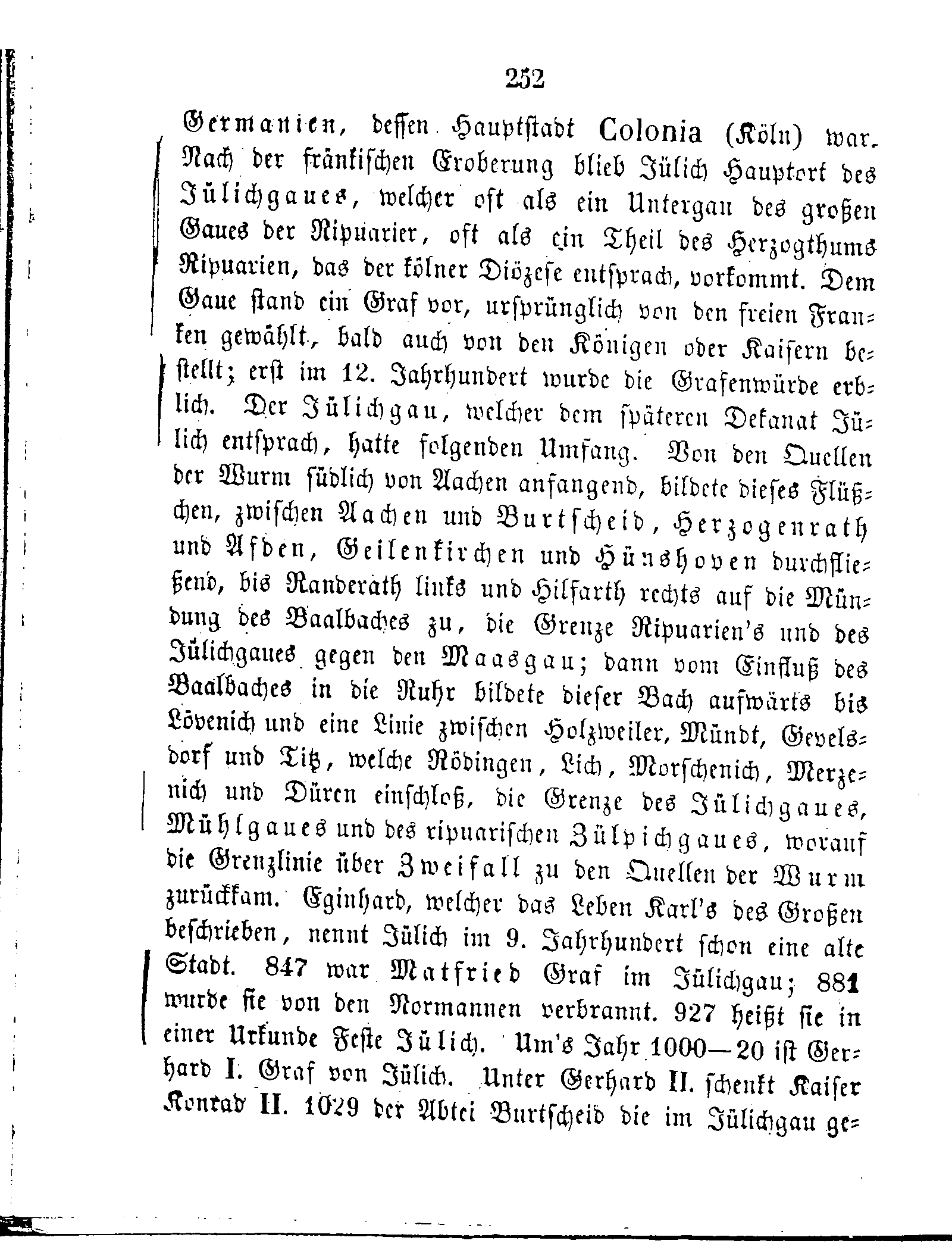 dessen Hauptstadt Colonia (Köln) war. Nach der fränkischen Eroberung blieb Jülich Hauptort des Jülichgaues, welcher oft als ein Untergau des großen Gaues der Ripuarier, oft als ein Theil des Herzogtums Ripuarien, das der kölner Diözese entsprach, vorkommt. Dem Gaue stand ein Graf vor, ursprünglich von den freien Franken gewählt, bald auch von den Königen oder Kaisern bestellt; erst im 12. Jahrhundert wurde die Grafenwürde erblich. Der Jülichgau, welcher dem späteren Dekanat Jülich entsprach, hatte folgenden Umfang. Von den Quellen der Wurm südlich von Aachen anfangend, bildete dieses Flüßchen, zwischen Aachen und Burtscheid, Herzogenrath und Afden, Geilenkirchen und Hünshoven durchfließend, bis Randerath links und Hilfarth rechts auf die Mündung des Baalbaches zu, die Grenze Ripuarien's und des Jülichgaues gegen den Maasgau; dann vom Einfluß des Baalbaches in die Ruhr bildete dieser Bach aufwärts bis Lövenich und eine Linie zwischen Holzweiler, Mündt, Gevelsdorf und Titz, welche Rödingen, Lich, Morschenich, Merzenich und Düren einschloß, die Grenze des Jülichgaues, Mühlgaues und des ripuarischen Zülpichgaues, worauf die Grenzlinie über Zweifall zu den Quellen der Wurm zurückkam. Eginhard, welcher das Leben Karl's des Großen beschrieben, nennt Jülich im 9. Jahrhundert schon eine alte Stadt. 847 war Matfried Graf im Jülichgau; 881 wurde sie von den Normannen verbrannt. 927 heißt sie in einer Urkunde Feste Jülich. Um's Jahr 1000-20 ist Gerhard I. Graf von Jülich. Unter Gerhard II. schenkt Kaiser Konrad II. 1029 der Abtei Burtscheid die im Jülichgau gelegenen