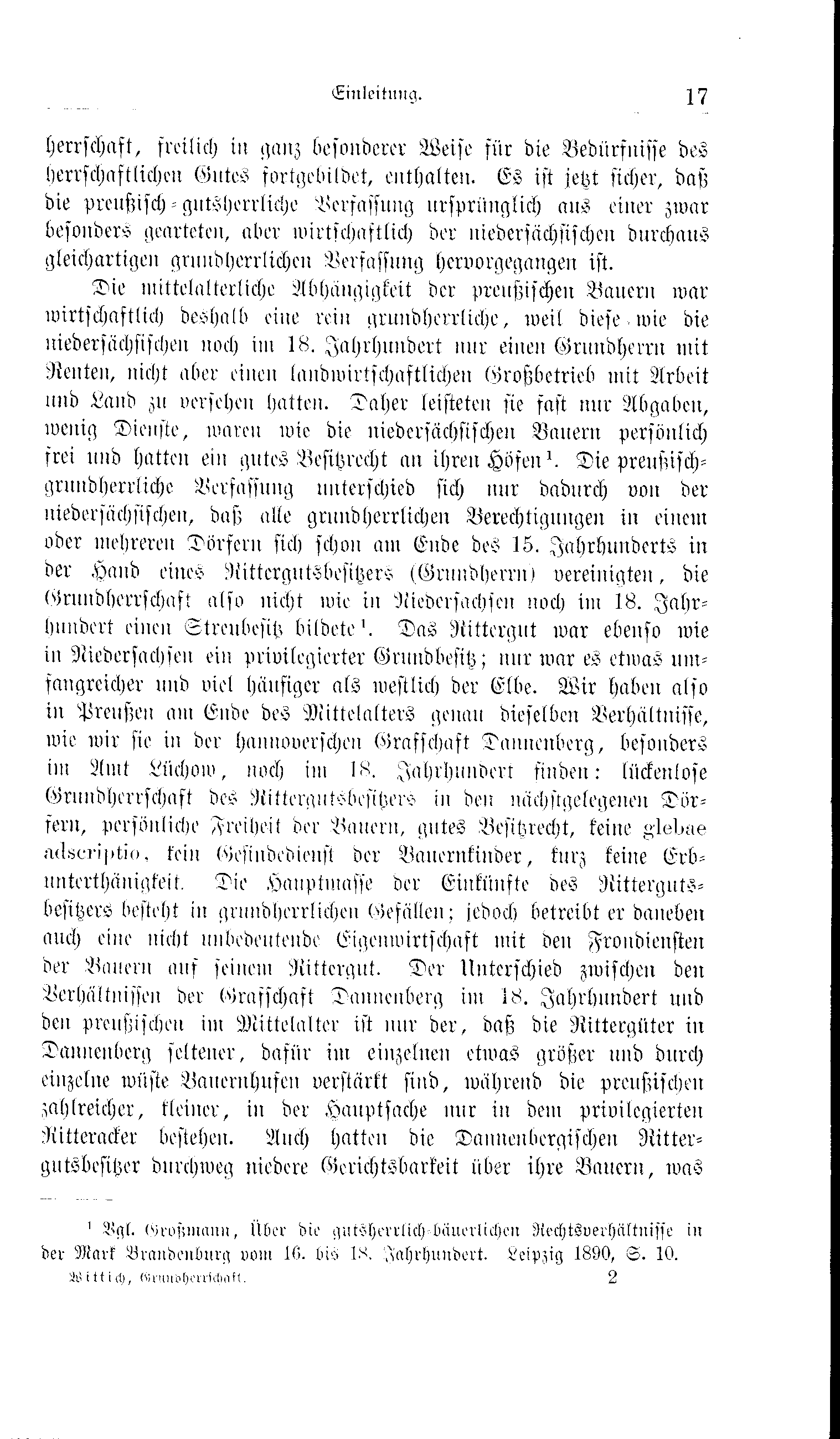 Die mittelalterliche Abhängigkeit der preußischen Bauern war wirtschaftlich deshalb eine rein grundherrliche, weil diese, wie die niedersächsischen noch im 18. Jahrhundert, nur einen Grundherrn mit Renten, nicht aber einen landwirtschaftlichen Großbetrieb mit Arbeit und Land zu versehen hatten. Daher leisteten sie fast nur Abgaben, wenig Dienste, waren wie die niedersächsischen Bauern persönlich frei und hatten ein gutes Besitzrecht an ihren Höfen.<ref>Vgl. Großmann, ''Über die gutsherrlich-bäuerlichen Rechtsverhältnisse in der Mark Brandenburg vom 16. bis 18. Jahrhundert''. Leipzig 1890, S.10.</ref> Die preußisch-grundherrliche Verfassung unterschied sich nur dadurch von der niedersächsischen, daß alle grundherrlichen Berechtigungen in einem oder mehreren Dörfern sich schon am Ende des 15. Jahrhunderts in der Hand eines Rittergutsbesitzers (Grundherrn) vereinigten, die Grundherrschaft also nicht wie in Niedersachsen noch im 18. Jahrhundert einen Streubesitz bildete. Das Rittergut war ebenso wie in Niedersachsen ein privilegierter Grundbesitz; nur war es etwas umfangreicher und viel häufiger als westlich der Elbe. Wir haben also in Preußen am Ende des Mittelalters genau dieselben Verhältnisse, wie wir sie in der hannoverschen Grafschaft Dannenberg, besonders im Amt Lüchow, noch im 18. Jahrhundert finden: lückenlose Grundherrschaft des Rittergutsbesitzers in den nächstgelegenen Dörfern, persönliche Freiheit der Bauern, gutes Besitzrecht, keine | Die mittelalterliche Abhängigkeit der preußischen Bauern war wirtschaftlich deshalb eine rein grundherrliche, weil diese, wie die niedersächsischen noch im 18. Jahrhundert, nur einen Grundherrn mit Renten, nicht aber einen landwirtschaftlichen Großbetrieb mit Arbeit und Land zu versehen hatten. Daher leisteten sie fast nur Abgaben, wenig Dienste, waren wie die niedersächsischen Bauern persönlich frei und hatten ein gutes Besitzrecht an ihren Höfen.<ref>Vgl. Großmann, ''Über die gutsherrlich-bäuerlichen Rechtsverhältnisse in der Mark Brandenburg vom 16. bis 18. Jahrhundert''. Leipzig 1890, S.10.</ref> Die preußisch-grundherrliche Verfassung unterschied sich nur dadurch von der niedersächsischen, daß alle grundherrlichen Berechtigungen in einem oder mehreren Dörfern sich schon am Ende des 15. Jahrhunderts in der Hand eines Rittergutsbesitzers (Grundherrn) vereinigten, die Grundherrschaft also nicht wie in Niedersachsen noch im 18. Jahrhundert einen Streubesitz bildete. Das Rittergut war ebenso wie in Niedersachsen ein privilegierter Grundbesitz; nur war es etwas umfangreicher und viel häufiger als westlich der Elbe. Wir haben also in Preußen am Ende des Mittelalters genau dieselben Verhältnisse, wie wir sie in der hannoverschen Grafschaft Dannenberg, besonders im Amt Lüchow, noch im 18. Jahrhundert finden: lückenlose Grundherrschaft des Rittergutsbesitzers in den nächstgelegenen Dörfern, persönliche Freiheit der Bauern, gutes Besitzrecht, keine <tt>glebae adscriptio</tt>, kein Gesindedienst der Bauernkinder, kurz keine Erbunterthänigkeit. Die Hauptmasse der Einkünfte des Rittergutsbesitzers besteht in grundherrlichen Gefällen; jedoch betreibt er daneben auch eine nicht unbedeutende Eigenwirtschaft mit den Frondiensten der Bauern auf seinem Rittergut. Der Unterschied zwischen den Verhältnissen der Grafschaft Dannenberg im 18. Jahrhundert und den preußischen im Mittelalter ist nur der, daß die Rittergüter in Dannenberg seltener, dafür im einzelnen etwas größer und durch einzelne wüste Bauernhufen verstärkt sind, während die preußischen zahlreicher, kleiner, in der Hauptsache nur in dem privilegierten Ritteracker bestehen. Auch hatten die Dannenbergischen Rittergutsbesitzer durchweg niedere Gerichtsbarkeit über ihre Bauern, was | ||