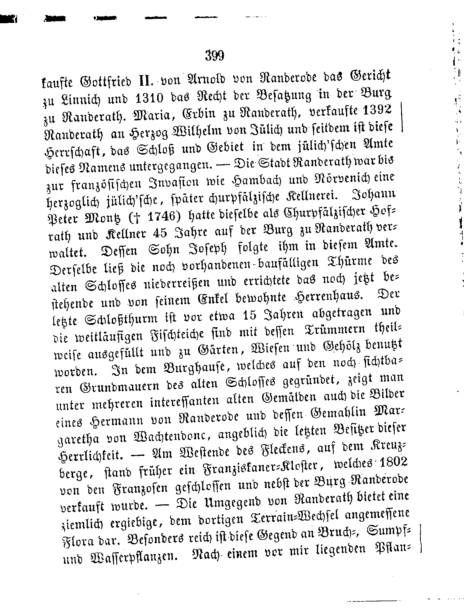kaufte Gottfried II. von Arnold von Randerode das Gericht zu Linnich und 1310 das Recht der Besatzung in der Burg zu Randerath. Maria, Erbin zu Randerath, verkaufte 1392 Randerath an Herzog Wilhelm von Jülich und seitdem ist diese Herrschaft, das Schloß und Gebiet in dem jülich'schen Amte dieses Namens untergegangen. — Die Stadt Randerath war bis zur französischen Invasion wie Hambach und Nörvenich eine herzoglich jülich'sche, später churpfälzische Kellnerei. Johann Peter Montz († 1746) hatte dieselbe als Churpfälzischer Hofrath und Kellner 45 Jahre auf der Burg zu Randerath verwaltet. Dessen Sohn Joseph folgte ihm in diesem Amte. Derselbe ließ die noch vorhandenen baufälligen Thürme des alten Schlosses niederreißen und errichtete das noch jetzt bestehende und von seinem Enkel bewohnte Herrenhaus. Der letzte Schloßthurm ist vor etwa 15 Jahren abgetragen und die weitläufigen Fischteiche sind mit dessen Trümmern theilweise ausgefüllt und zu Gärten, Wiesen und Gehölz benutzt worden. In dem Burghause, welches auf den noch sichtbaren Grundmauern des alten Schlosses gegründet, zeigt man unter mehreren interessanten alten Gemälden auch die Bilder eines Hermann von Randerode und dessen Gemahlin Margaretha von Wachtendonc, angeblich die letzten Besitzer dieser Herrlichkeit. — Am Westende des Fleckens, auf dem Kreuzberge, stand früher ein Franziskaner-Kloster, welches 1802 von den Franzosen geschlossen und nebst der Burg Randerode verkauft wurde. — Die Umgegend von Randerath bietet eine ziemlich ergiebige, dem dortigen Terrain-Wechsel angemessene Flora dar. Besonders reich ist diese Gegend an Bruch-, Sumpf- und Wasserpflanzen. Nach einem vor mir liegenden Pflanzenverzeichniß